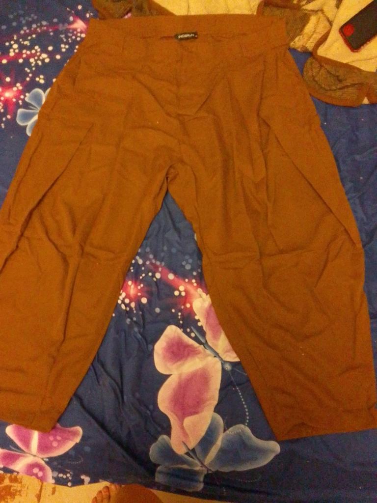 Брюками в целом я очень довольна, качество отменное, ткань не знаю какая, нет этикетки, но не просвечивает, довольно плотная, на лето. Спереди заложены складки, два глубоких кармана. Замеры брюк: ОТ 118см, ОБ 164см за счёт складок, может и больше, длина 106см, при моем росте 164см мне по щиколотку, с каблучком будет нормально, подворачивать не буду. Спасибо Джум за качественную вещь.