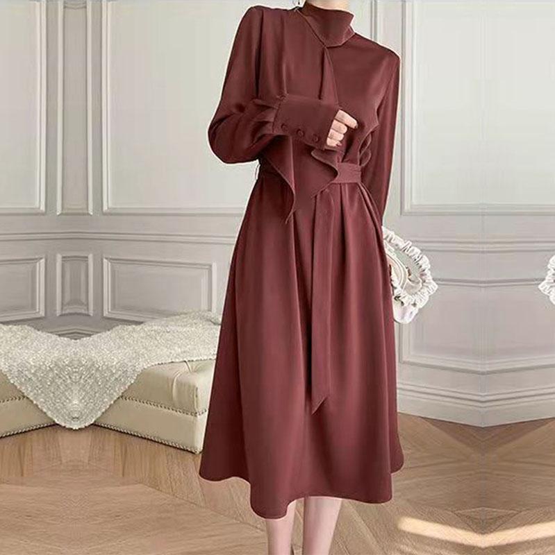 Женское платье с воротником-стойкой и длинным рукавом, тонкое женское платье трапециевидной формы с поясом, M-3XL — купить товар онлайн с бесплатной доставкой по всему миру!