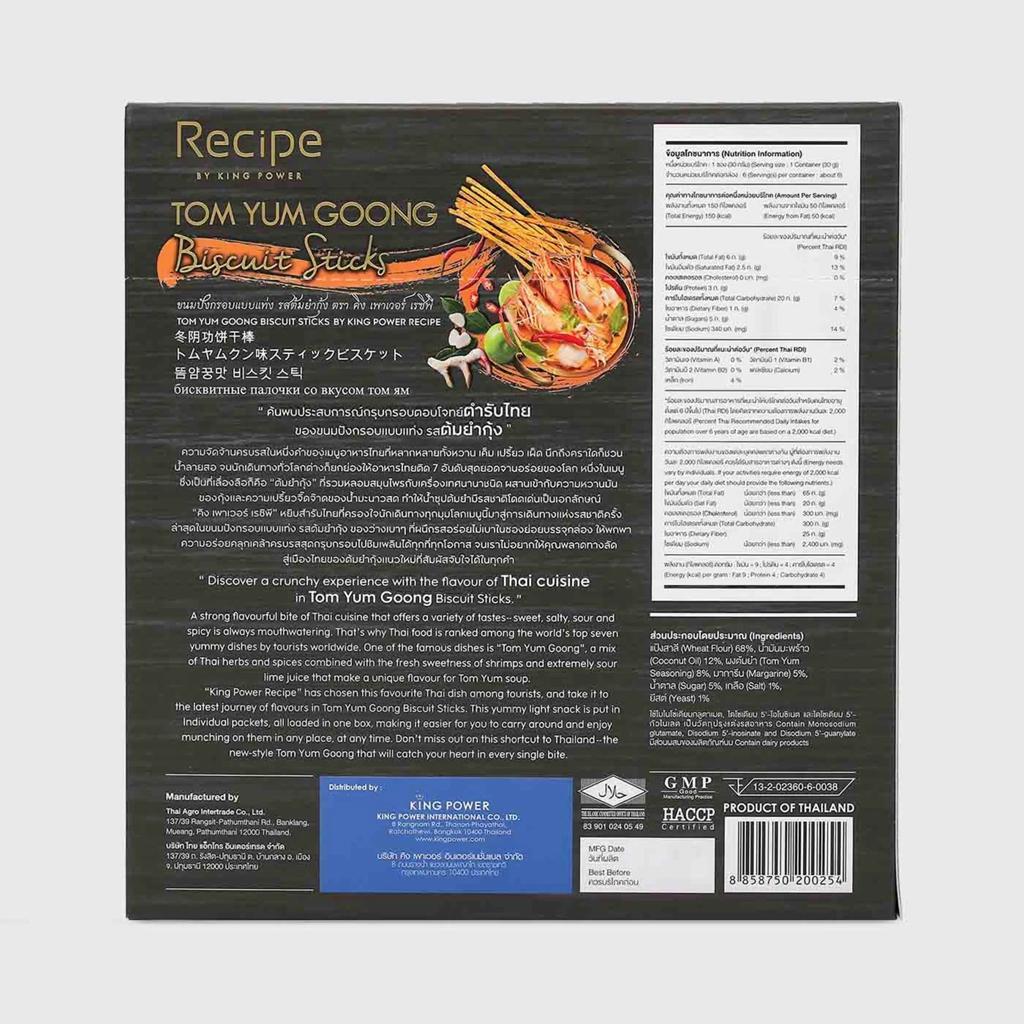 «King Power Recipe» выбрал «Tom Yum Goong», любимое тайское блюдо среди туристов, и взял его в последнее путешествие вкусов в Tom Yum Goong Biscuit Sticks. Эта вкусная легкая закуска помещается в отдельные пакеты, загруженные в одну коробку, что облегчает вам переноску и наслаждение ими в любых местах и в любое время.. Не пропустите этот короткий путь в Таиланд - новый стиль Tom Yum Goong, который поймает ваше сердце в каждом укусе.