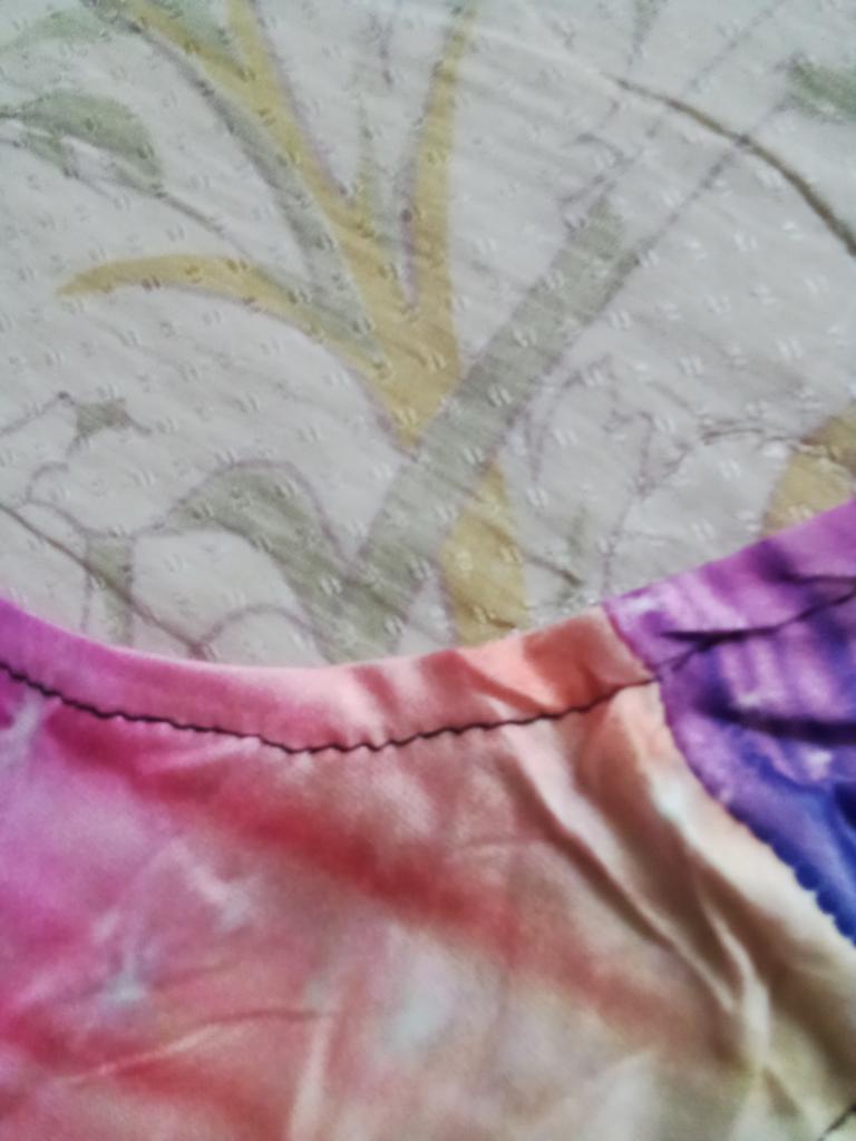 Блузка совсем не соответствует по расцветке, на фото она как бы об'емная, что придает пикантность блузке. На блузке плоские и не так сильно закрученные линии. На фото красивый ярко синий и лиловый цвет цвета полосок, по акту размытый синий и коричневато- лиловый. Строчки не ровные, поскольку все отсрочено черными нитками, то на светлых участках это бросается в глаза. В итоге получила не очень интересную и совсем некачественную майку