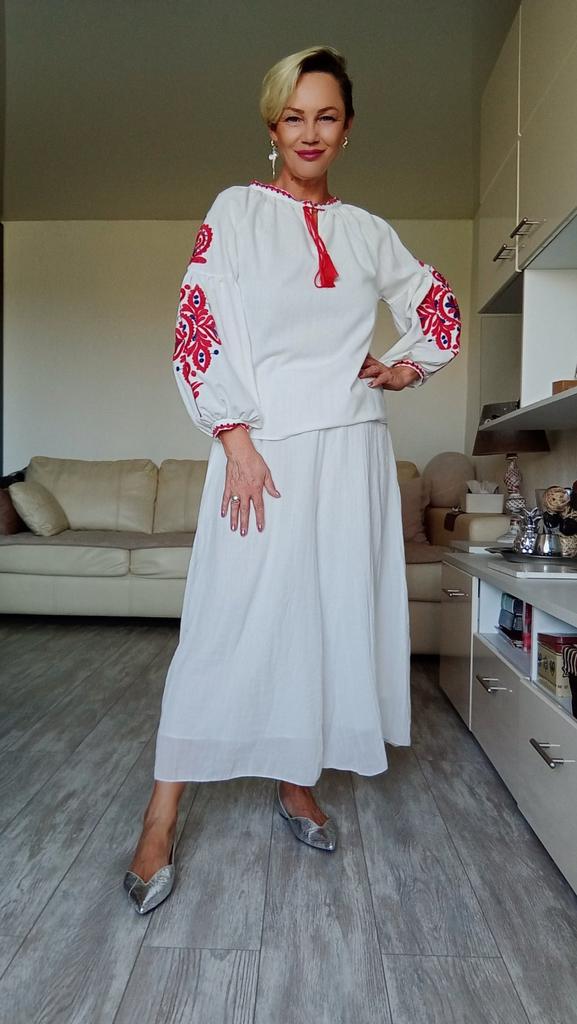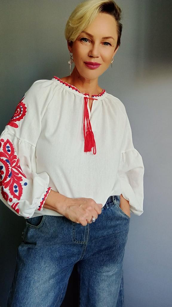 Новое прочтение вышиванки). Возможно, первая мысль, приходящая в голову при виде этой блузы- народный стиль. Так и есть) но как же круто она смотрится с джинсами ! Смело, свежо, и немного трогательно. 📌Блуза как на фото: Прямой силуэт На шее завязки Рукав фонарик. Рукава богато украшены вышивкой. С изнанки она имеет уплотнение в виде бумаги. Бумагу нужно убрать, или она сама отойдет после стирки. 📌Ткань плотная, натуральная, очень похожа на лён. Пошив аккуратный. 📌Размер единый. Три цвета на выбор. Мои параметры : 167, 96-82-98. 📐Замеры: Плечи нет Длина рукава от горловины 60 Длина рукава от подмышки 40 Ширина рукава вверху 18 ОГ подмышками 104 ОТ 105 ОБ 110 Длина 58