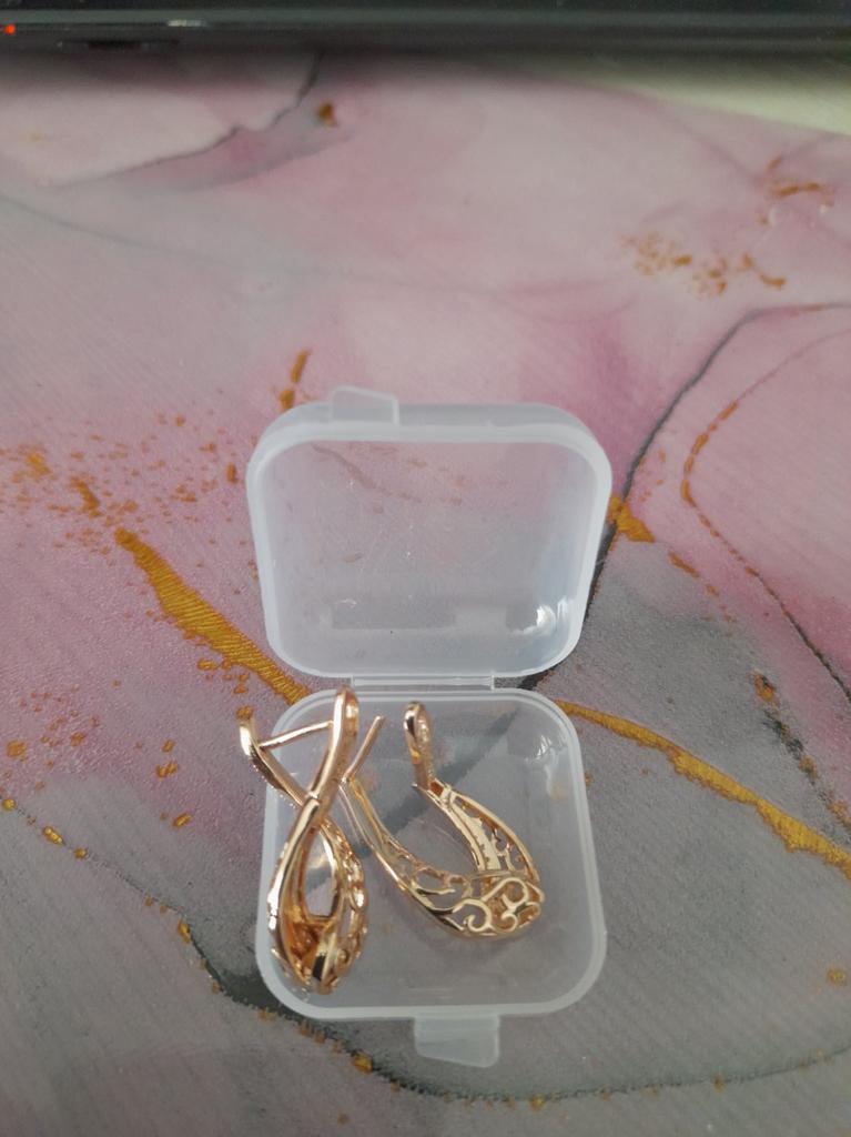 Оригинальные серьги, на ушах смотрятся симпатично. Металл похож на золото и имеет 585 пробу. Продавец отправил серёжки и колечко в прозрачной пластиковой коробочке. Замочки застёгиваются крепко. Заказом осталась довольна. Рекомендую к покупке. 7.04. заказала, 17.05. получила. Посылка отслеживалась до почтового отделения. В посылке было 5 заказов.