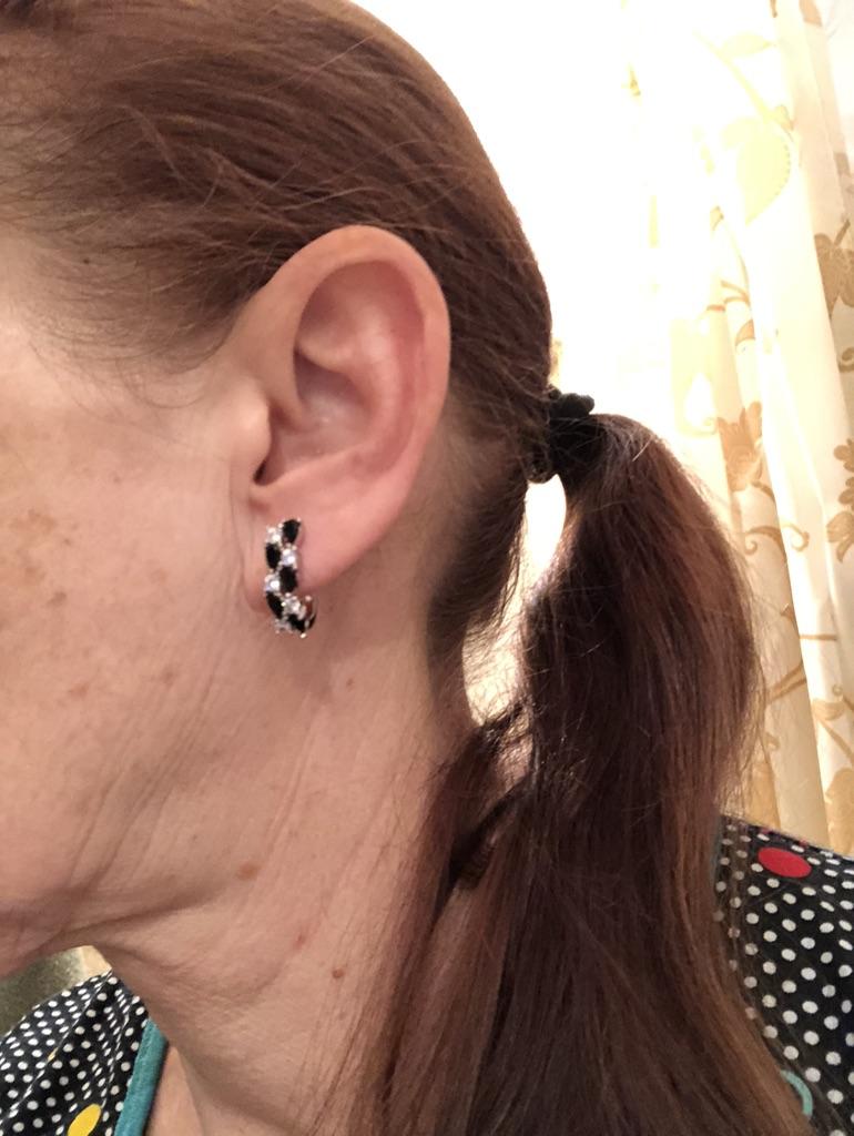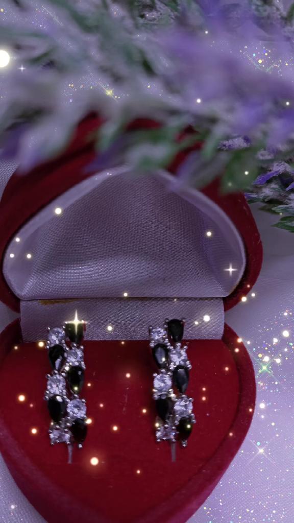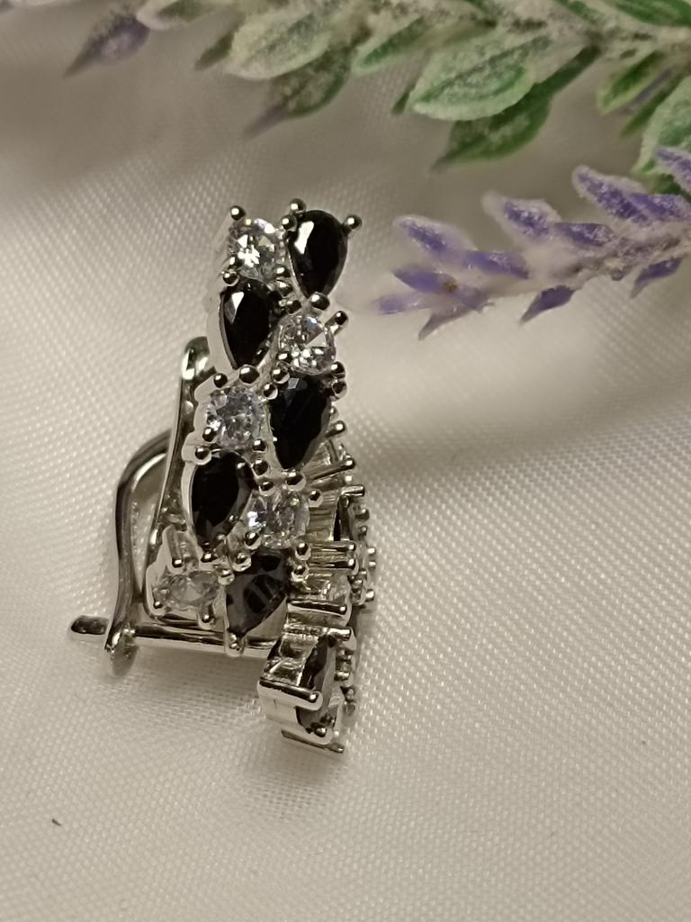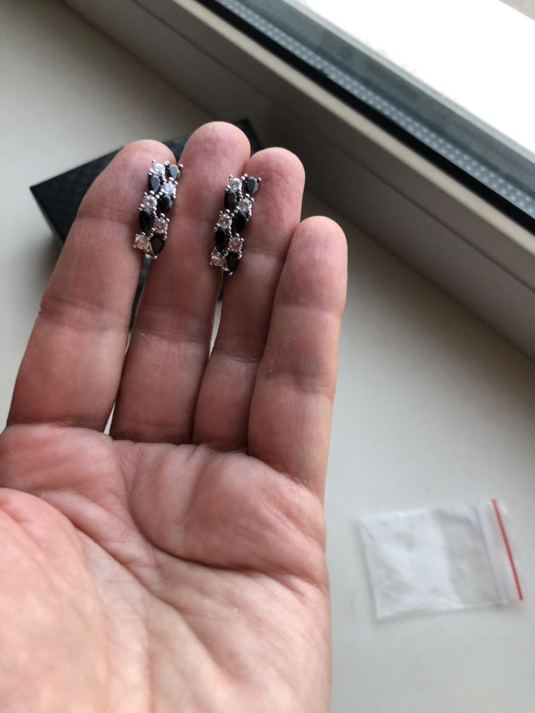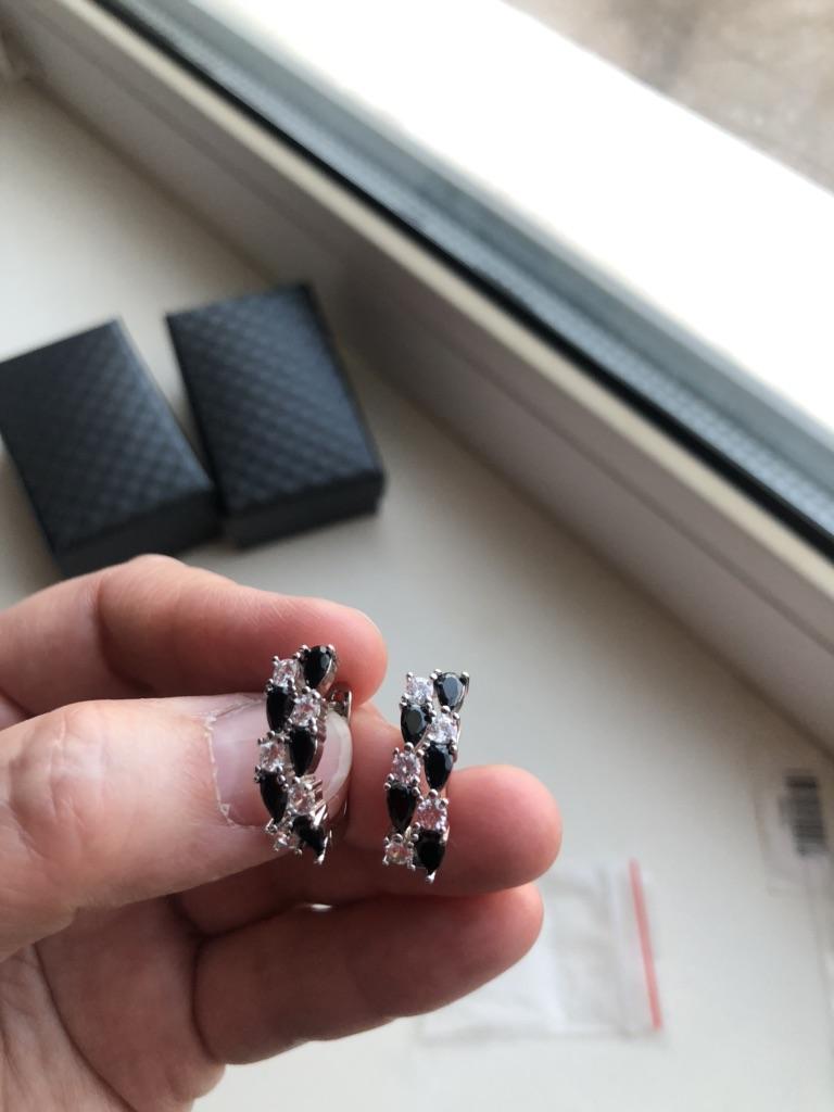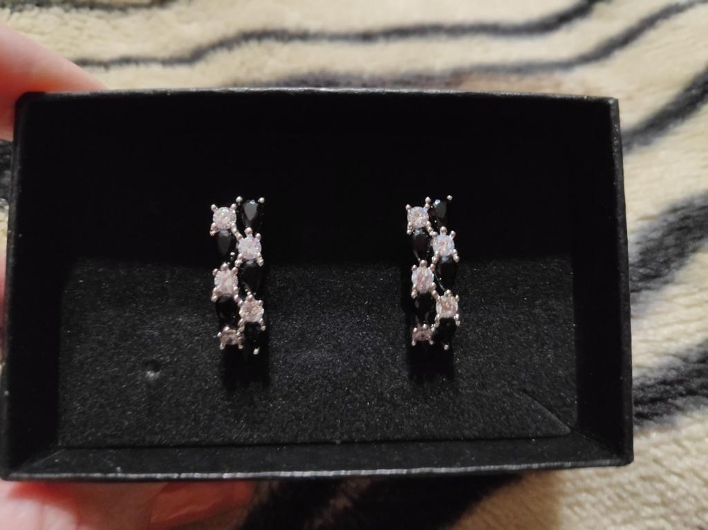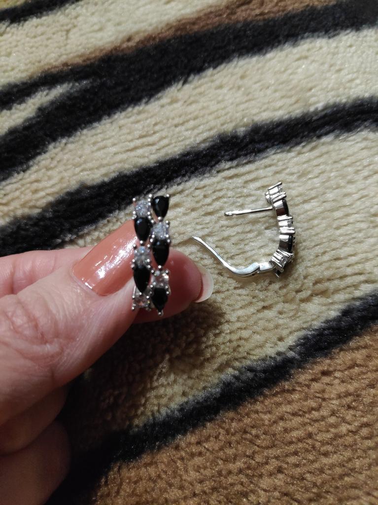 Серьги с чёрными и белыми камешками, похожи на косичку или колосок, от известного проверенного магазина Black Awn. Красивые серьги, смотрятся в ушках дорого, почти невесомые. Аллергию не вызвали, а у меня очень чувствительные мочки. Сделаны аккуратно, английский замочек, работают, всё на высоком уровне. Они не темнеют, я забыла снять и душ в них приняла, ничего с ними не случилось. Очень довольна покупкой. Заказывала несколько изделий, пришли сразу вместе в одной коробочке. Это очень удобно, не бегаешь за каждой парой. Доставка чуть больше месяца. Трек полностью отслеживался. Спасибо большое 🤗 продавцу за хороший товар и Джуму за доставку.