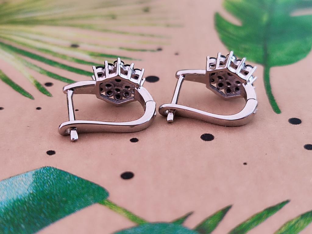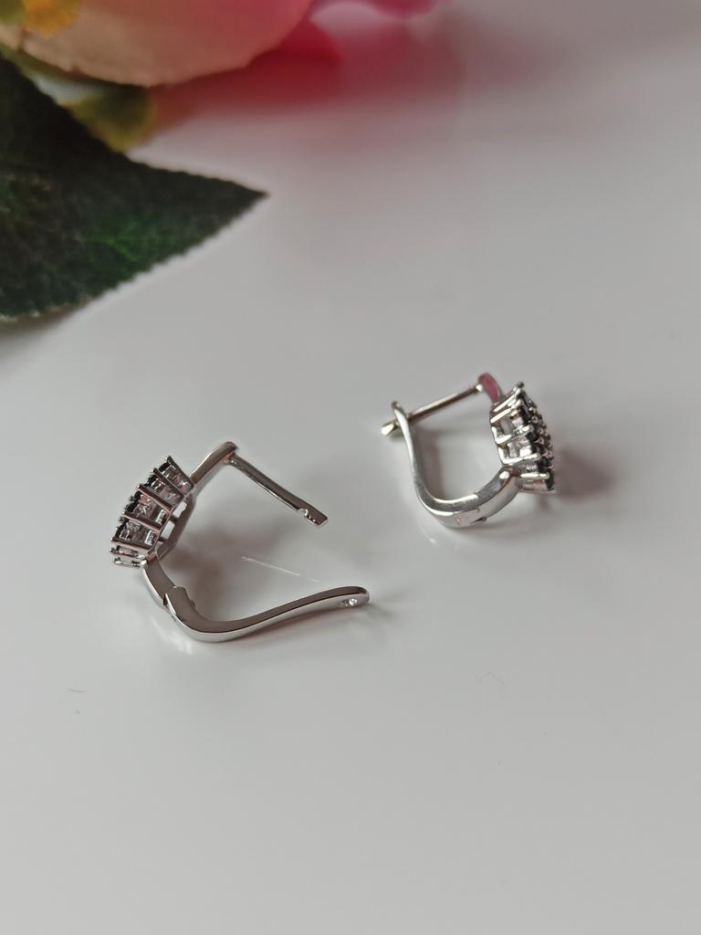Красивые нарядные серги. Пришли серги хорошо упакованы, в почтовом пакете, и в бархотном мешочке. Изготовлены серёжки из меди. Камни кубический церконий,при ярком свете переливаются. Качество изговления серёжек отличное, без заусениц, камни закреплены хорошо. Застежка держит хорошо. Такие серьги подойдут как на каждый день,так и к вечернему красивому наряду. На сережах стоит 925 проба. Аллергии серьги не вызывают. Смотрятся очень, очень красиво. Сережки понравились. Рекомендую сережки и продавца.