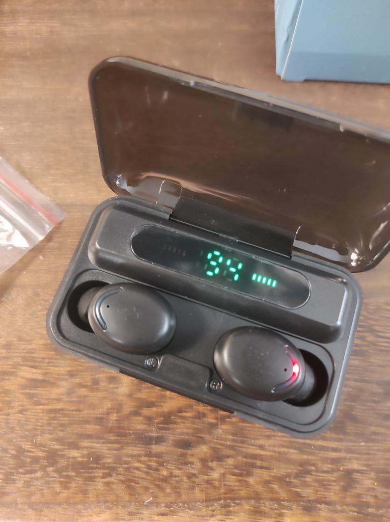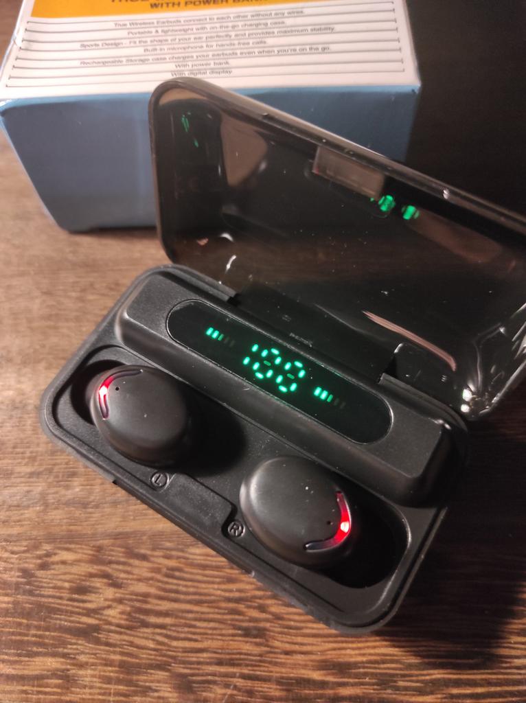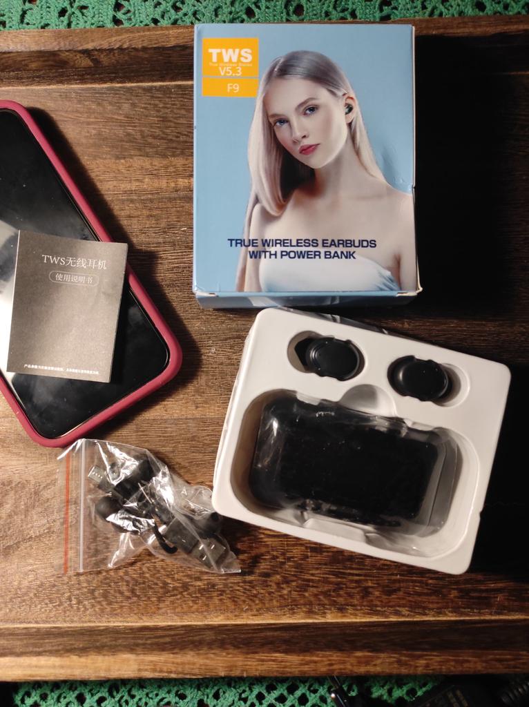 Наушники f9 В комплекте шнур usb, два разных размера запасных амбюшуров, сами наушники и зарядный бокс. Зарядный бокс может также служить и павербанком при необходимости. Можно экстренно подзарядить телефон, проверила, работает! Сами наушники надежно примагничиваются в бокс, правый и левый. Коннектятся с телефоном через блютуз. Заряд показывает. Бокс имеет крышку из темного полупрозрачного пластика, уровень заряда видно, не открывая. Звук нормальный, в рамках стоимости. Присмотритесь.