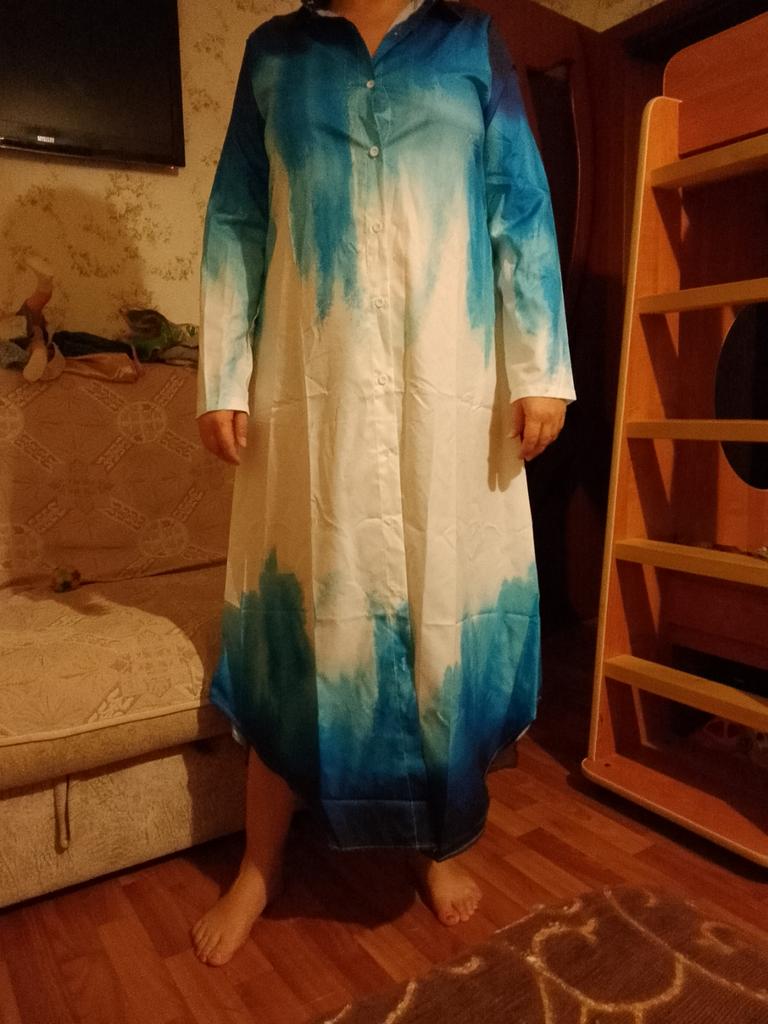 Товар получен. Платье рубашка Доставка: Доставка относительно быстрая. Трек отслеживался. Упаковано в пакет. Товар: В размер, на мои 172 длинное, но не в пол. Относительно качества, разочарована. Швы обработаны небрежно. Особенно это бросается в глаза на стойке воротника. Грубые закрепки, нитки торчат. Швы местами кривые. Ткань правда напоминает плащевку. Синтетика, с блестящим отливом. Летом будет очень жарко. Не светится. Край по бокам не имеет таких глубоких вырезов и сам крой отличается. На фото платье более расклёшенные к низу. В реалии больше похоже на мешок. Разве что под пояс. Но спасибо.