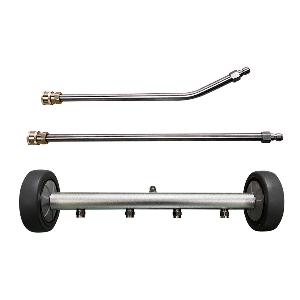 Двойная цель: Насадка для мойки высокого давления 2 в 1, с 4 соплами и 2 гибкими вращающимися колесами, может легко трансформироваться, работать в качестве очистителя ходовой части или водной метлы для ежедневной стирки с легкостью.