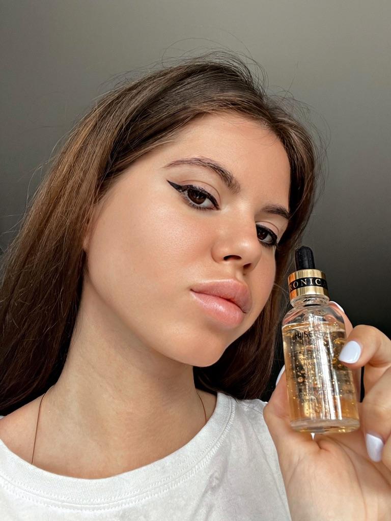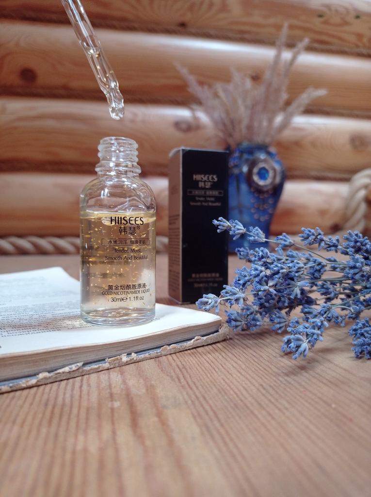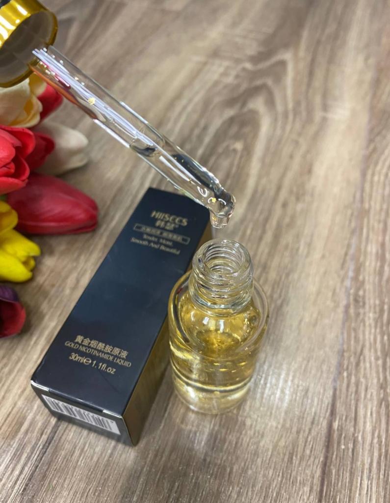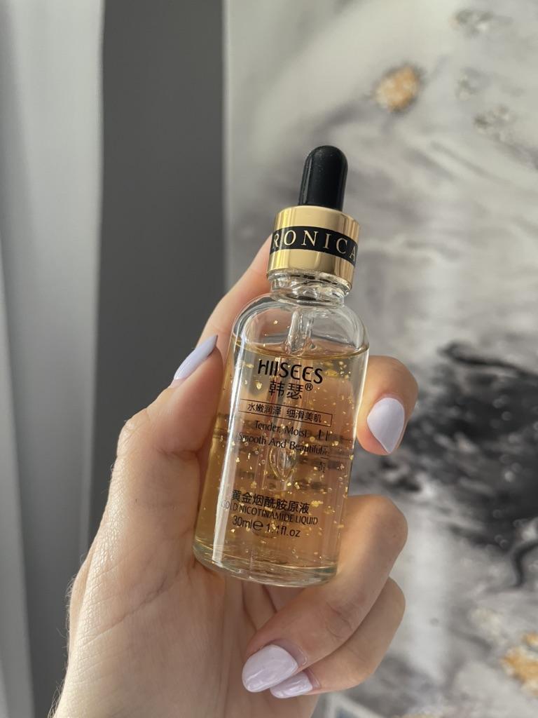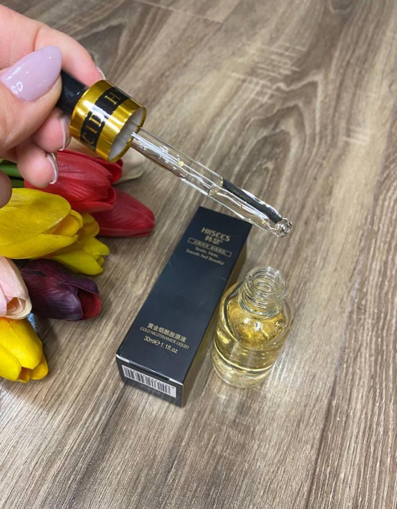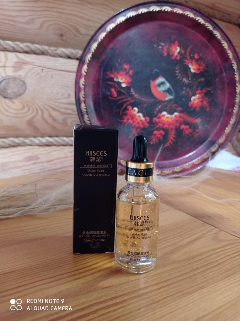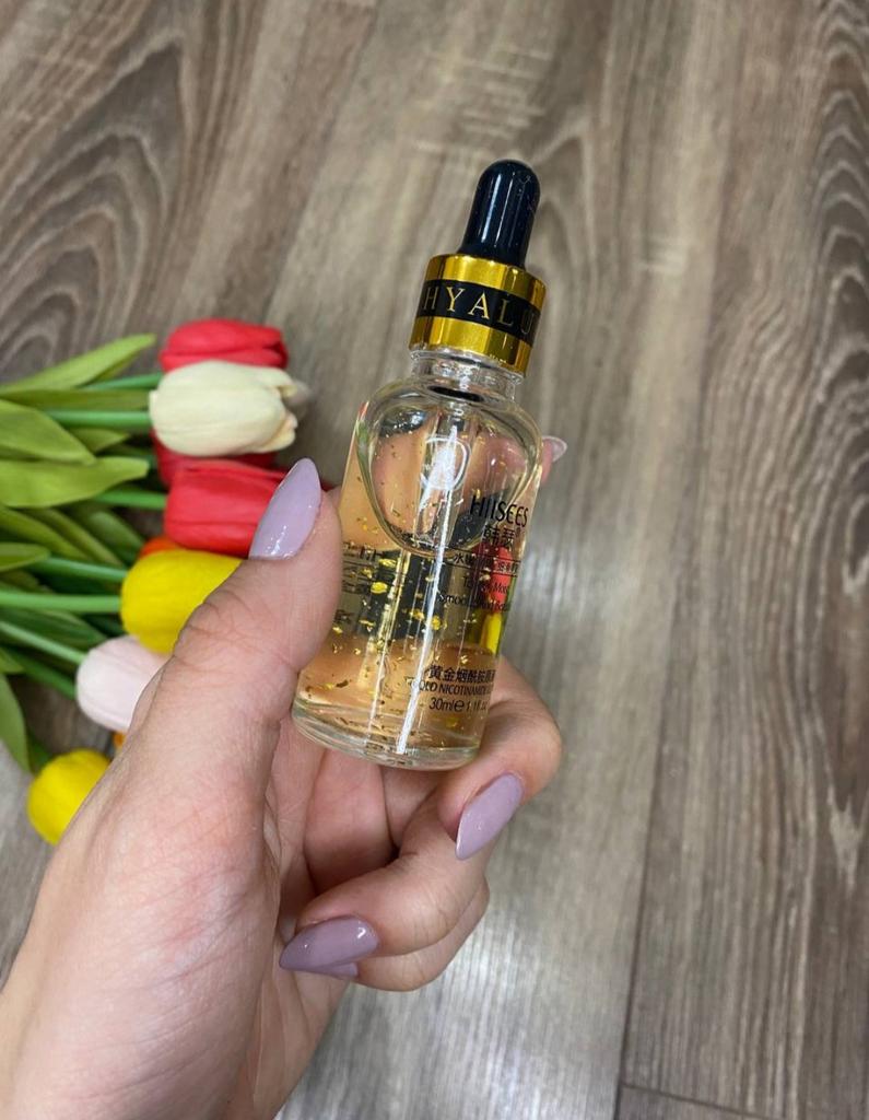 ✨ Золотая сыворотка для лица ✨ Текстура у нее, как и всех подобных сывороток, чуть тягучее воды. Сыворотка хорошо увлажняет кожу, мне нравится, я вообще часто беру разнообразные сыворотки. Информация от производителя: Сыворотка увлажняет и питает кожу лица, борясь с мел ими мимическими морщинками за счёт содержания в ней молекул гиалуроната натрия*. Также сыворотка улучшает тон кожи, уменьшает поры. Видимые изменения после первого применения. *Гиалуронат натрия — это структурный компонент многих тканей человеческого тела. Он находится в коже, глазах, хрящевых соединениях, нервах. Вещество было открыто в 1934 году. В косметологии гиалуронат натрия выступает средством №1 в вопросах сохранения молодости и красоты кожи. Способ применения: С помощью пипетки нанести небольшое количество сыворотки на очищенную кожу, вбить похлопывающими движениями до полного впитывания. Применять 2 раза в день. Обычно сыворотку наносят перед нанесением крема, но после тонера. Или можно просто использовать самостоятельно. После применения есть ощущение липкости, но это быстро проходит. Обладает приятным ненавязчивым ароматом. Срок годности указан на упаковке. После вскрытия пузырька использовать в течение 12 мес. Объем стеклянного пузырька 30 мл. Я храню его в холодильнике. Не забудьте нанести сыворотку на внутренний сгиб локля, чтобы убедиться, что у вас нет на нее аллергии. Сыворотка доставлена в почтовое отделение за месяц живым треком в сборной посылке 👍 Товар и продавца рекомендую 👍