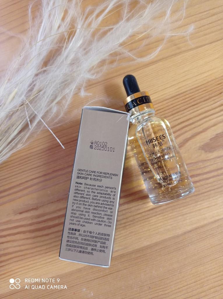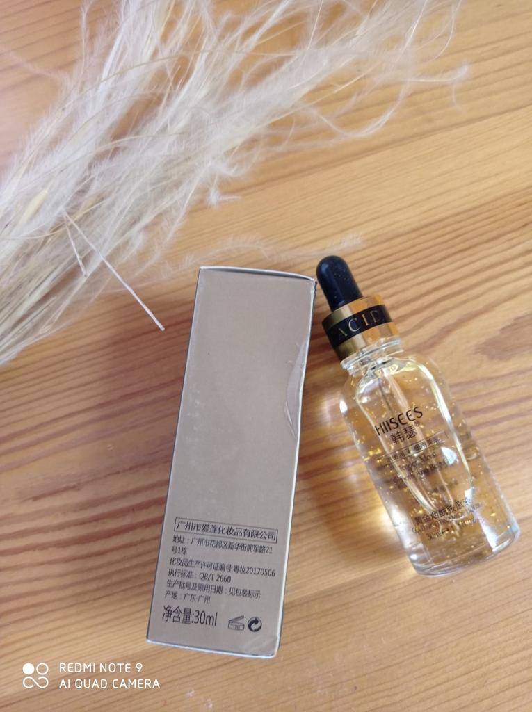 ✨ Золотая сыворотка для лица ✨ Текстура у нее, как и всех подобных сывороток, чуть тягучее воды. Сыворотка хорошо увлажняет кожу, мне нравится, я вообще часто беру разнообразные сыворотки. Информация от производителя: Сыворотка увлажняет и питает кожу лица, борясь с мел ими мимическими морщинками за счёт содержания в ней молекул гиалуроната натрия*. *Гиалуронат натрия — это структурный компонент многих тканей человеческого тела. Он находится в коже, глазах, хрящевых соединениях, нервах. Вещество было открыто в 1934 году. В косметологии гиалуронат натрия выступает средством №1 в вопросах сохранения молодости и красоты кожи. Способ применения: Нанести небольшое количество сыворотки на очищенную кожу, вбить похлопывающими движениями до полного впитывания. Применять 2 раза в день. Обычно сыворотку наносят перед нанесением крема, но после тонера. Или можно просто использовать самостоятельно. После применения есть ощущение липкости, но это быстро проходит. Обладает приятным ненавязчивым ароматом. Срок годности указан на упаковке. После вскрытия пузырька использовать в течение 12 мес. Объем стеклянного пузырька 30 мл. Я храню его в холодильнике. Лично мое мнение после использования сыворотки: Она увлажняет не утяжеляет кожу, нет липкости. Все. Больше мне от нее ничего не надо, а она в принципе, ничего больше и не даст. Сыворотка доставлена в почтовое отделение за 1,5 месяца живым треком в сборной посылке 👍 Товар и продавца рекомендую 👍