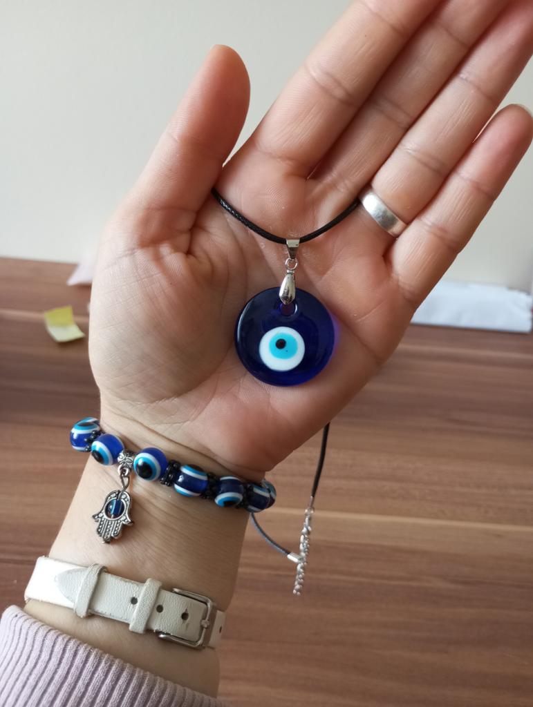 Очень красивый кулон от сглаза. На фото браслет, теперь вот кулон. Изготовлен из стекла тёмно-синего цвета. Глядя на свет, видны вкрапления. В середине сам "глазик". Пришёл с кожаным шнурком в маленьком пакетике. Не разбит и не поцарапан. Мне очень понравился, давно такой хотела. Спасибо большое продавцу. Я очень рада🥰🥰🥰🥰😍.