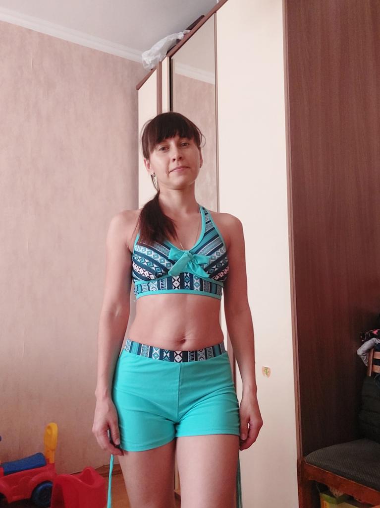 Купальник точно соответствует указанному цвету! Такой и хотела! Купальник сшит хорошо и ткань приятная, впрочем как у большинства одежды для купания. Необычный вариант для меня - это шорты и топ. : Выглядит красиво и не дёшево. Удобные шорты, сбоку завязки для затягивания.Резинка комфортная. : Топ очень красиво подчёркивает спину. Чашки на топе отлично поддерживают грудь. Ей там комфортно😄 ! Я б сказала достаточно удобные, НО... На небольшую грудь!! : Размер у меня S по их меркам. Ношу российский сейчас где то 42..раньше подошёл бы идеально, при моем размере 40 раньше, сейчас хорошо, но если чуть чуть ещё и был бы малой топ. : Рекомендую купальник 😉