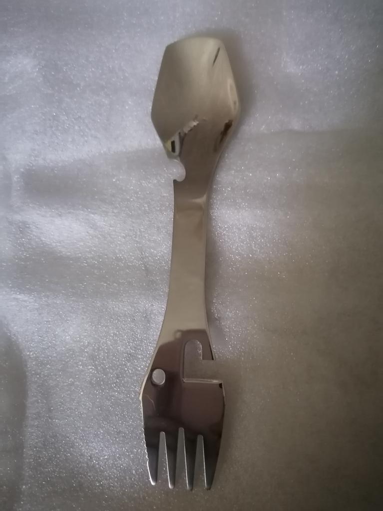 Универсальная ложка с одной стороны, а с другой вилка имеются открывалка для бутылок и банок , сделано из нержавеющей стали спасибо Джум