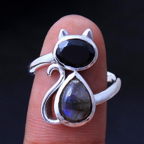 Кольцо с кошкой, кольцо с черным ониксом, ювелирные изделия ручной работы из стерлингового серебра 925 пробы, серебряное кольцо с изображением животных