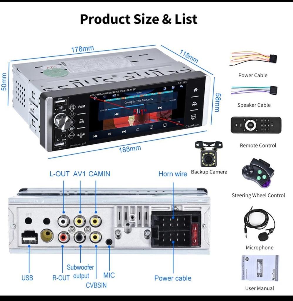Hikity 1 Din 5,1-дюймовый сенсорный экран Автомобильный MP5-плеер AI Voice Carplay/Android Auto Deep Bass Bluetooth FM Руль AUX USB SD Media Вид сзади