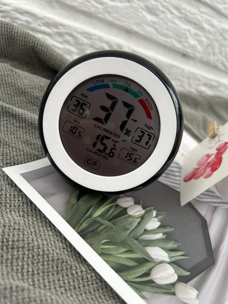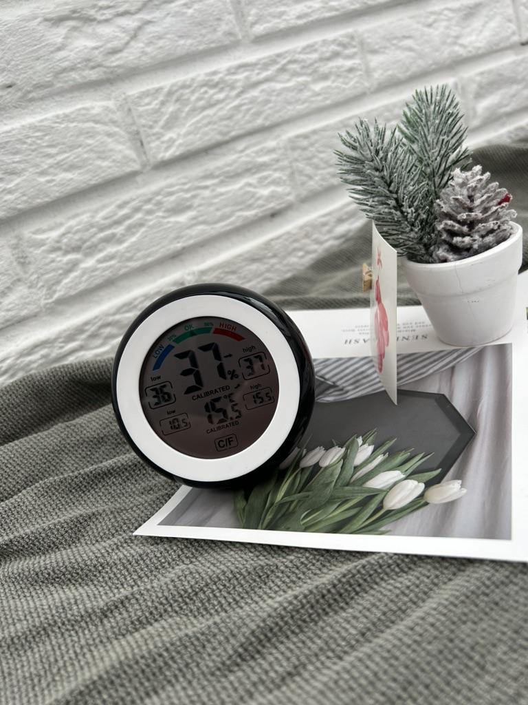 Многофункциональная вещь в дом Он и температуру померит и влажность. А еще скажет где надо увлажнить и какая была мах и мин температура Классная вещь на самом деле. Мне очень нужна была. У него есть подставка и также его можно вешать куда угодно. Работает от двух батареек ААА. В комплекте инструкция,сам пришел в коробочке. Не повредился при транспортировке. Качественно сделан и смотрится в интерьере стильно и красиво. Доставка в РБ 3 недели.