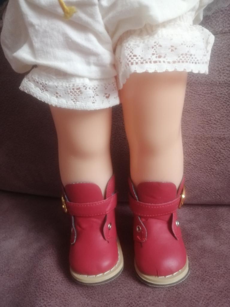 Только получила, кукла ещё не приведена полностью в порядок. Но они ей подошли, намного лучше первоначальных резиновых сапожек. Внутренний размер у них меньше внешнего на толщину подошвы (примерно около 3-4мм со всех сторон). Единственный минус: на одном ботинке оказался небольшой брак: есть маленький разрез спереди и чуть содрано покрытие сбоку.