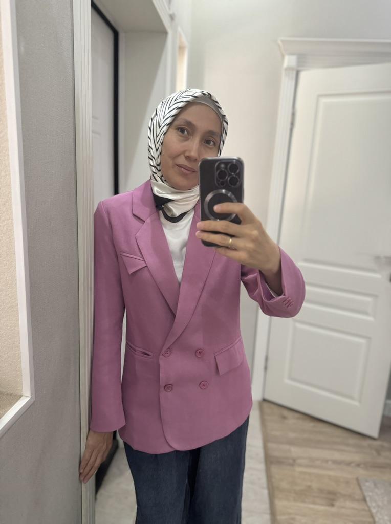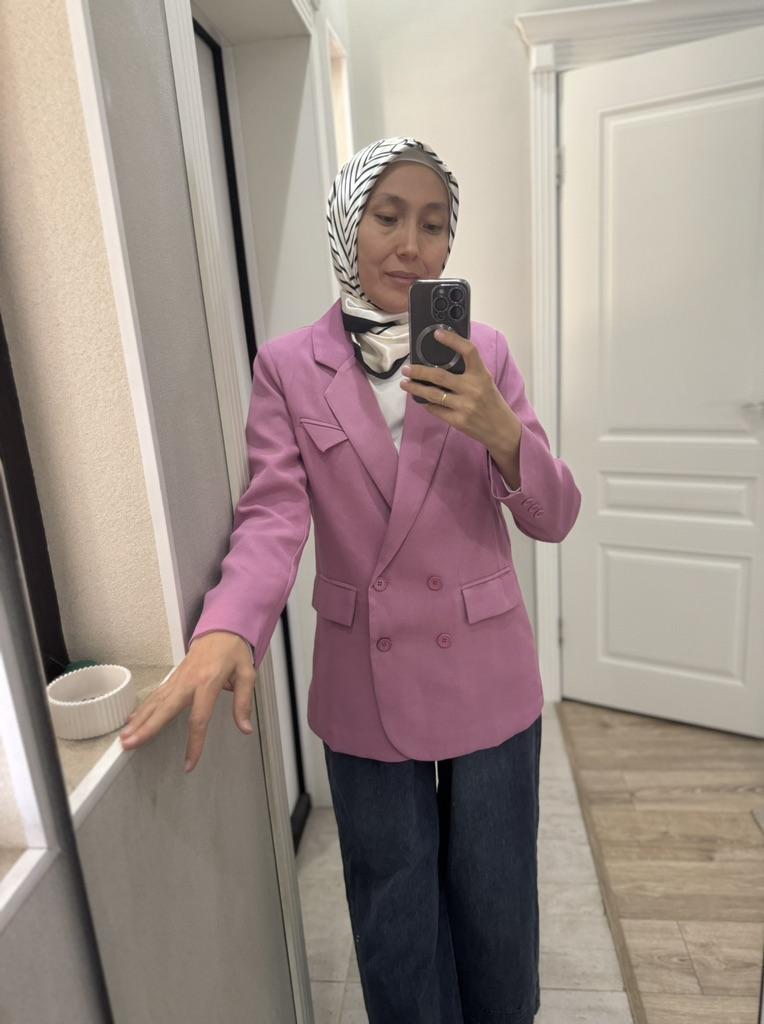 Пиджак очень хорошего качества. На мой 44 размер подошел размер М. Внутри подклад, материал пиджака похож на лень. Форму держит, все как на фото