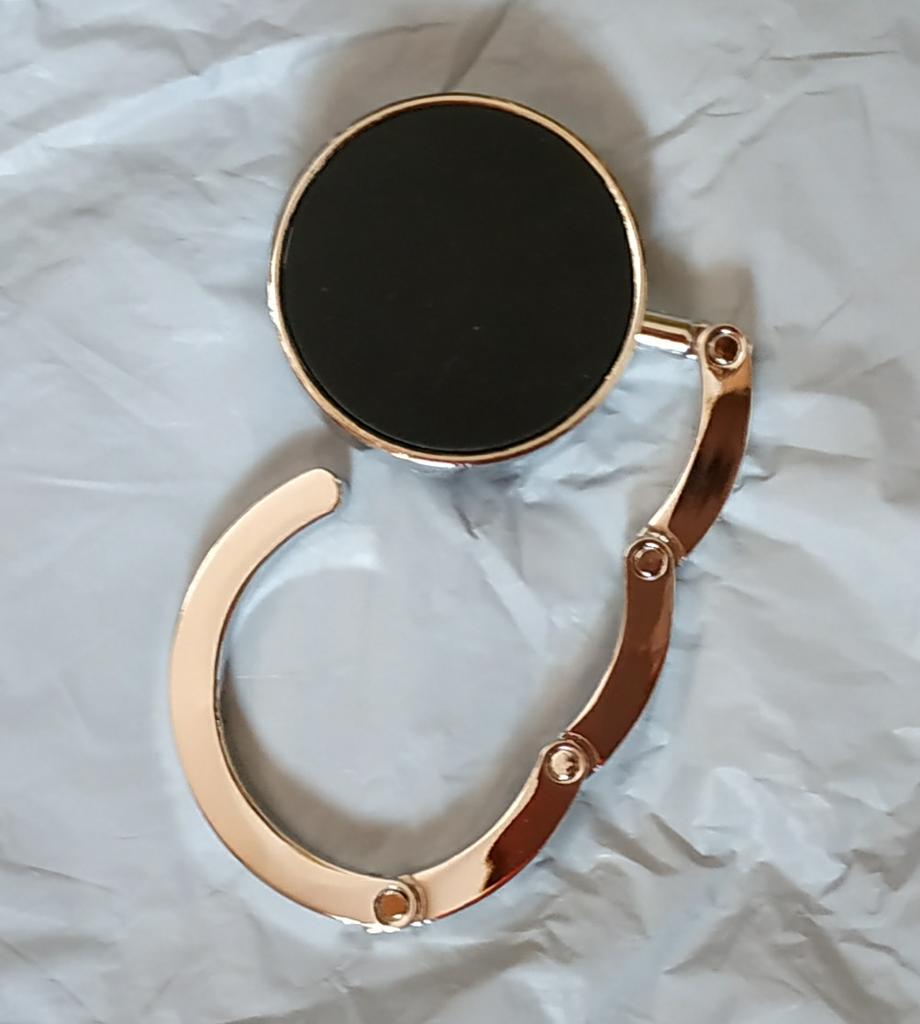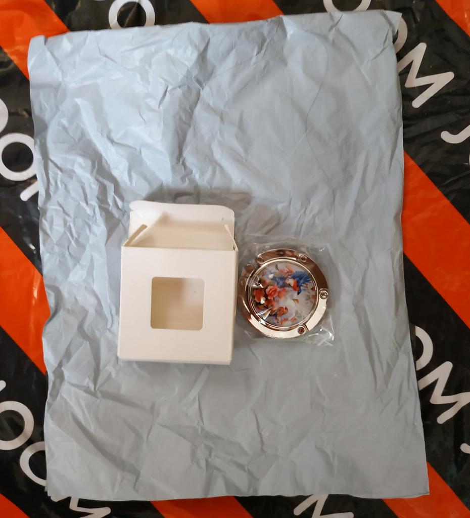 Очень красивый крюк для сумки, почти ювелирное украшение. :) Тем более, упакован был в маленький пакетик и коробочку. Качество безупречное, функцию выполняет, держится даже на скользкой полированной поверхности. Последнее фото - упаковка.