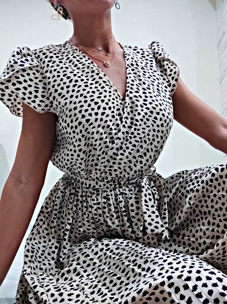 Летнее длинное платье с леопардовым принтом и короткими рукавами и V-образным вырезом и высокой талией