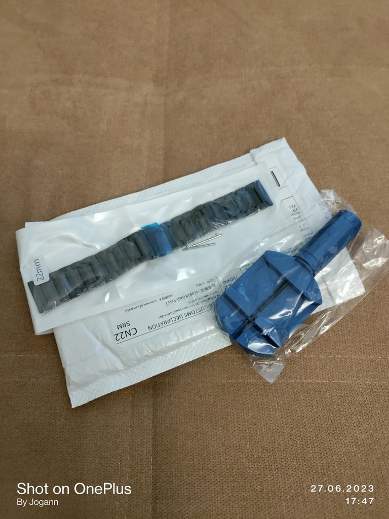 Посылку в Беларусь доставили за 20 дней. Упаковано в пупырку и целофановые пакетики, - всё дошло целым и невредимым. Браслет очень лёгкий, не похоже, что из металла,- может алюминий. При помощи станочка, вложенного дополнительно убрал 2 звена и полный порядок! Дальше будет видно. Браслет оригинальный, идущий с часами был немного весомее, но сломалась защёлка и пришлось заказать этот. Спасибо продавцу и Джуму!