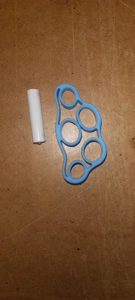 Синего цвета, упругий приятный на ощупь материал. Пришло за месяц, то что по акции за 1 балл. Места много не занимает, а для хаотичных или регулярных упражнений для развития пальцев самое то. Батарейка ааа на фото для сравнения.