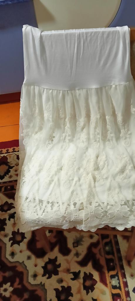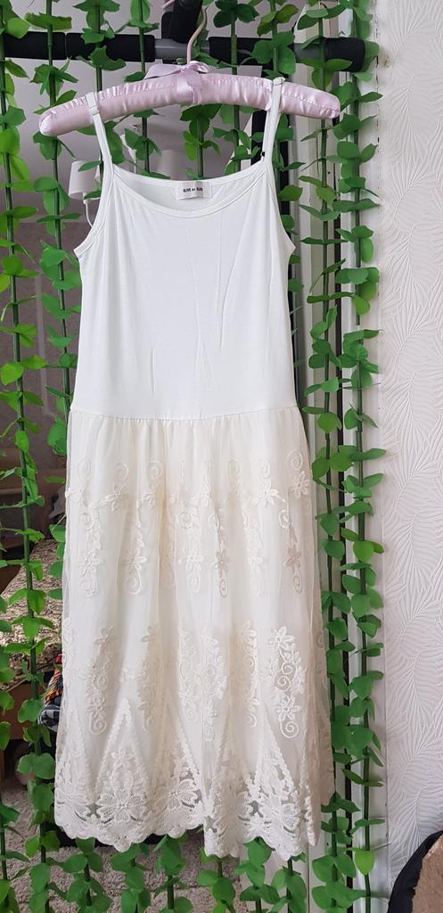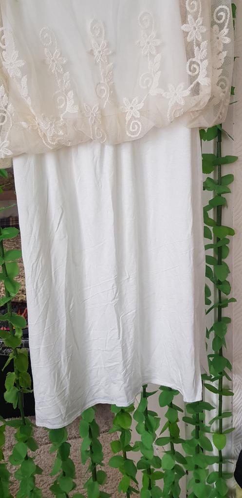 Нижнее платье скорее, молочного, чем белого цвета. Сшито качественно. Лямочки регулируются. Длина на рост 168 до колена. Очень понравилось, что колечки, которые держат и регулируют лямочки металлические, а не пластиковые, как это часто бывает. Кружевная юбочка сверху бежевого цвета, с желтоватым оттенком. Оставлю, как ночную сорочку. Закажу ещё чëрную, понравилась.