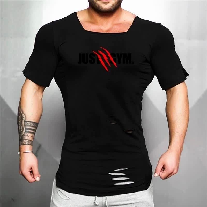Muscleguys Новая футболка для бодибилдинга для тренажерного зала, тонкая футболка с короткими рукавами и принтом, спортивная одежда для бега, хлопковая одежда с квадратным воротником, мужская рваная футболка для фитнеса