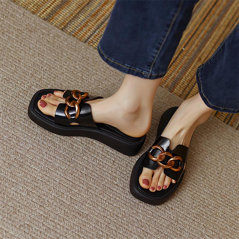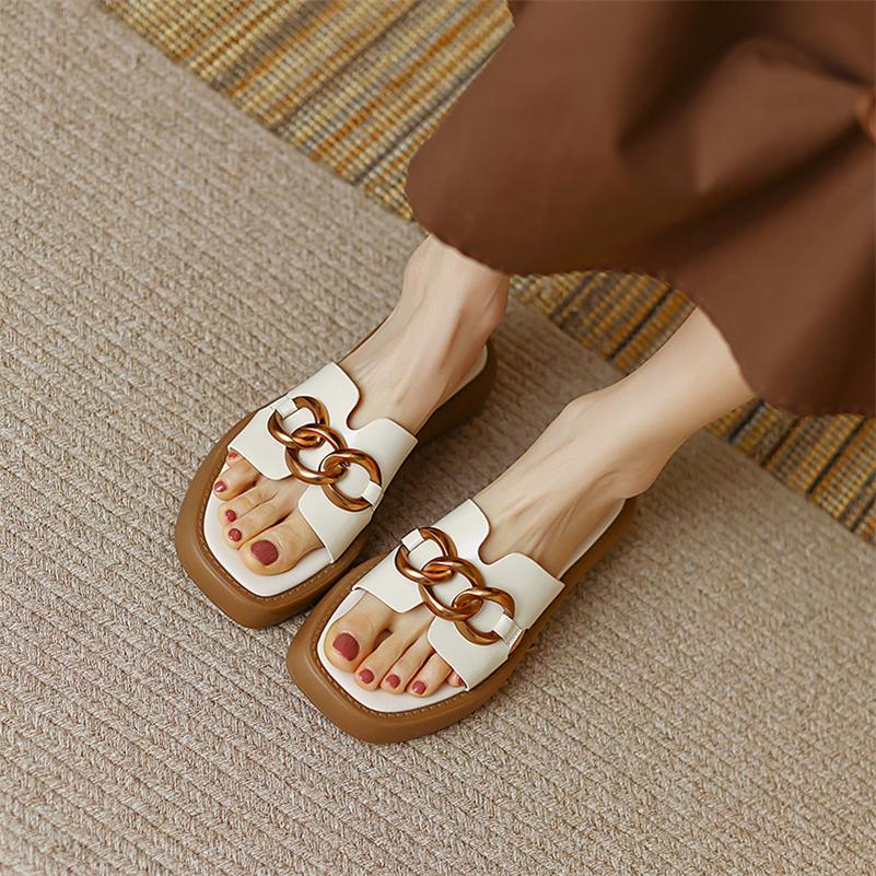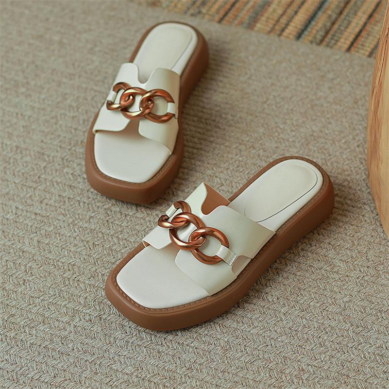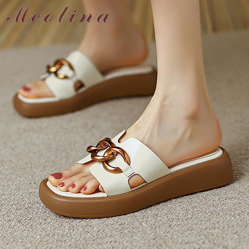 Meotina Женские сандалии из натуральной кожи, шлепанцы на плоской подошве с квадратным носком, повседневные женские тапочки на платформе с металлическими украшениями, новинка 2022, бежевый 40