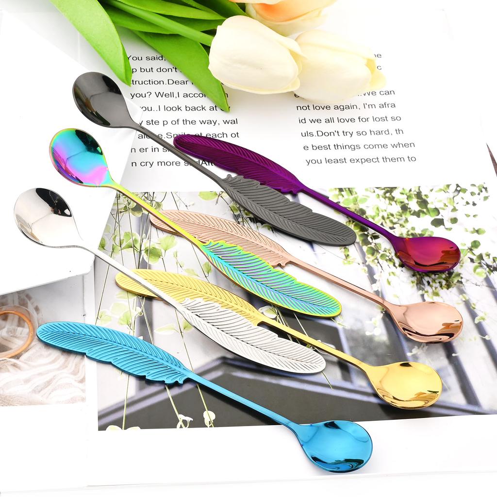 Креативная ложка, рождественский подарок, красочная ложка из нержавеющей стали 304 с узором из перьев, ложка для чая, кофе, кухонные аксессуары, посуда