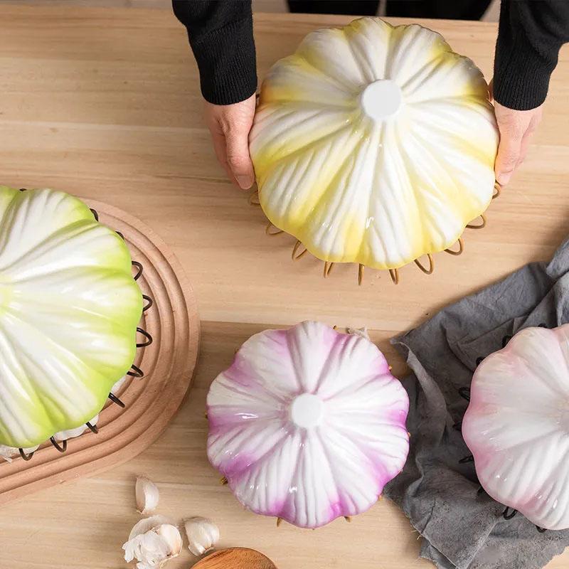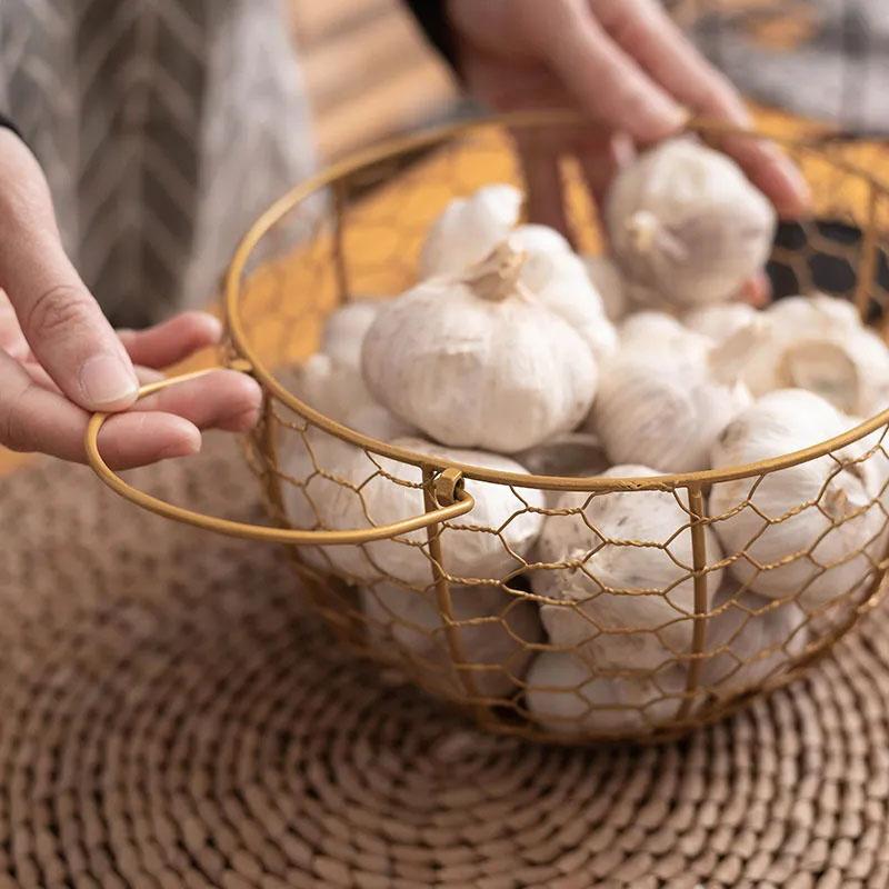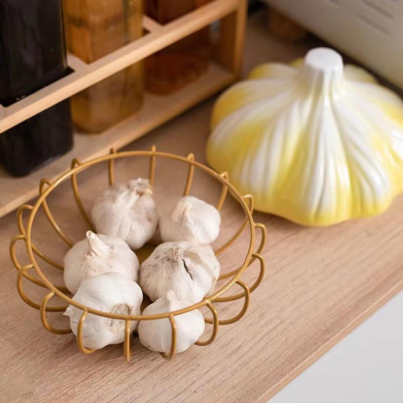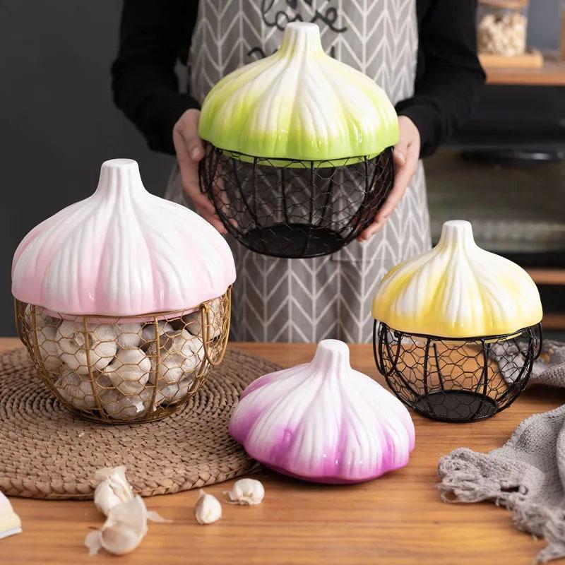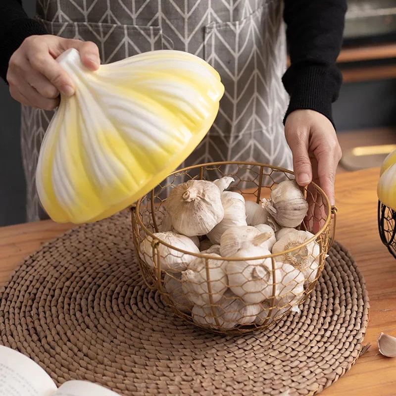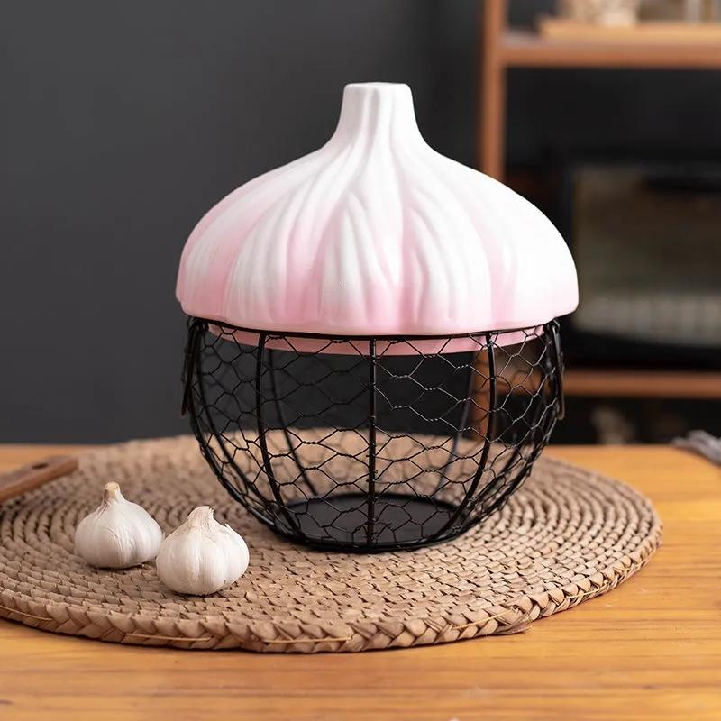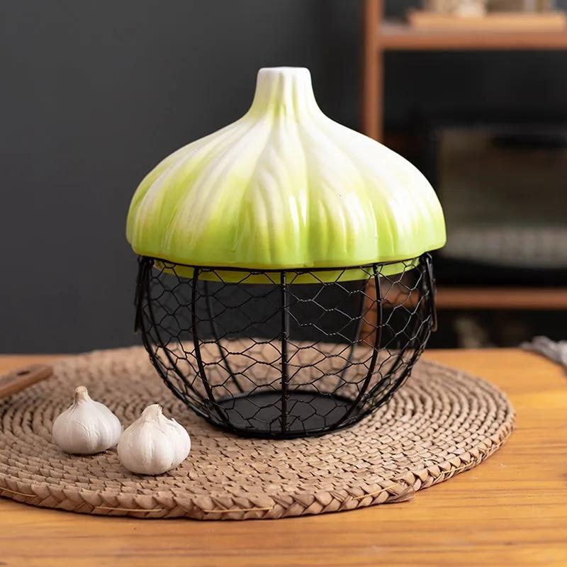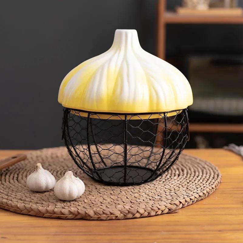 Коробка для хранения имбирного чеснока Симпатичная забавная корзина для чеснока с крышкой Полая дышащая керамическая железная корзина для яиц Кухонные декоративные украшения Симпатичная посуда