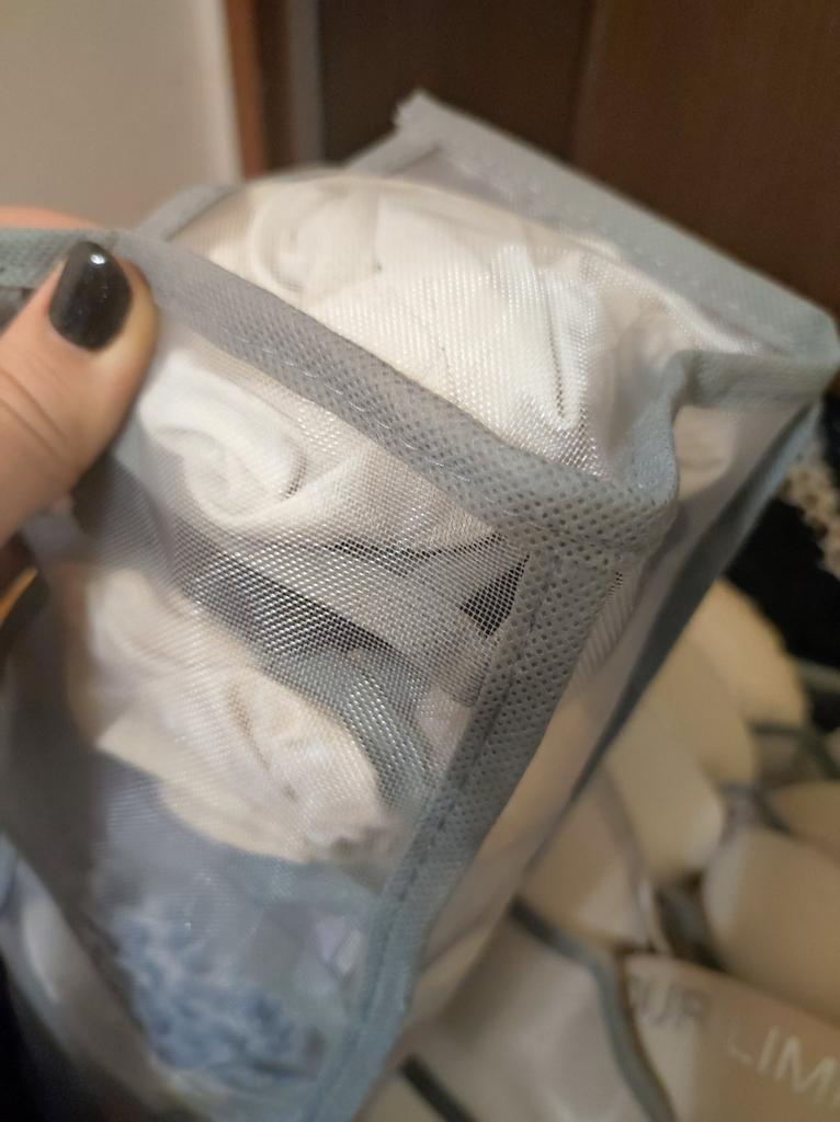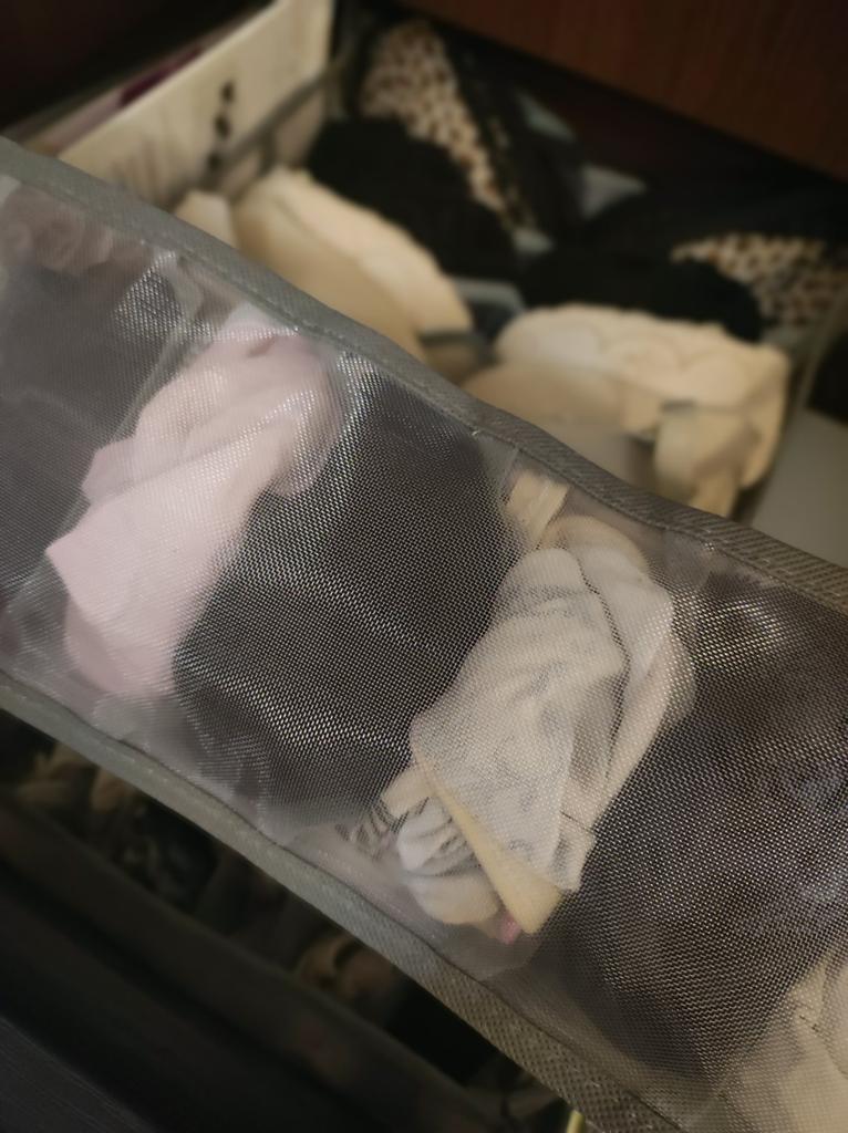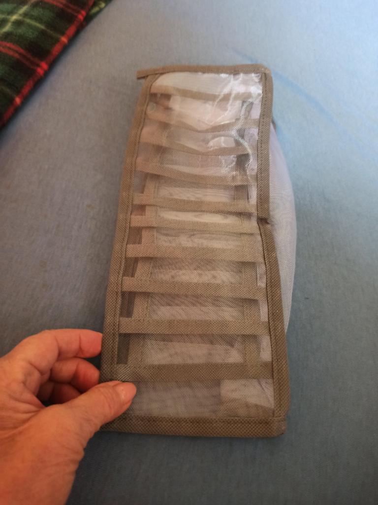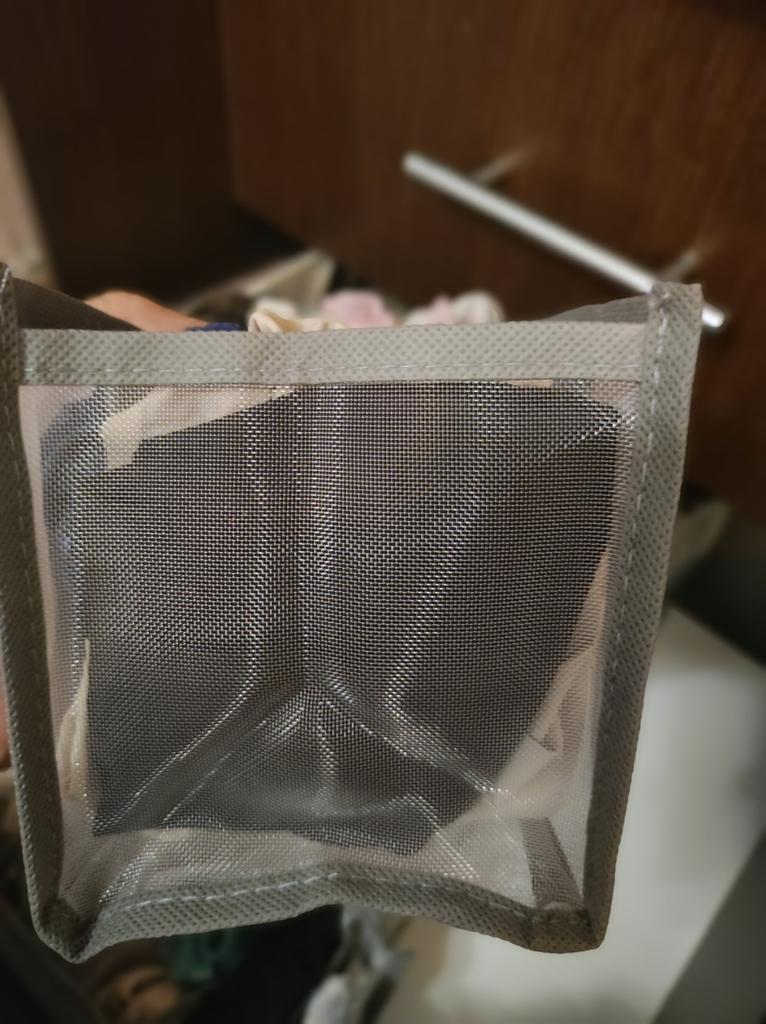 Это покупка для меня новинка, захотелось попробовать в деле и наконец навести порядок в одежде. Сам ящик, это сетка, но плотная, разделена на секции. Надеюсь эта покупка будет мне полезной, очень важно знать где, что лежит, это и сыкономит время, когда собираешься на работу и порядок в шкафу. Пока не использовала покупку, только получила. Потом добавлю свой отзыв..продавец упаковал хорошо, всё цело и не помялось. Спасибо продавцу.