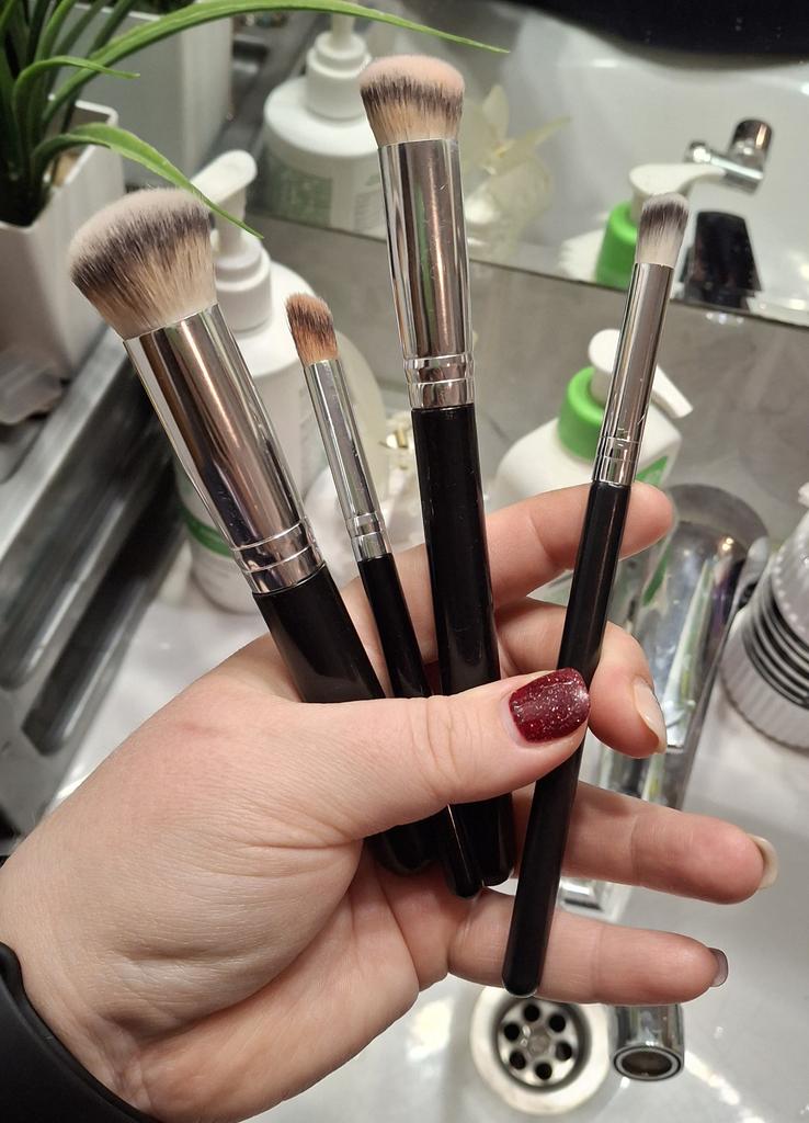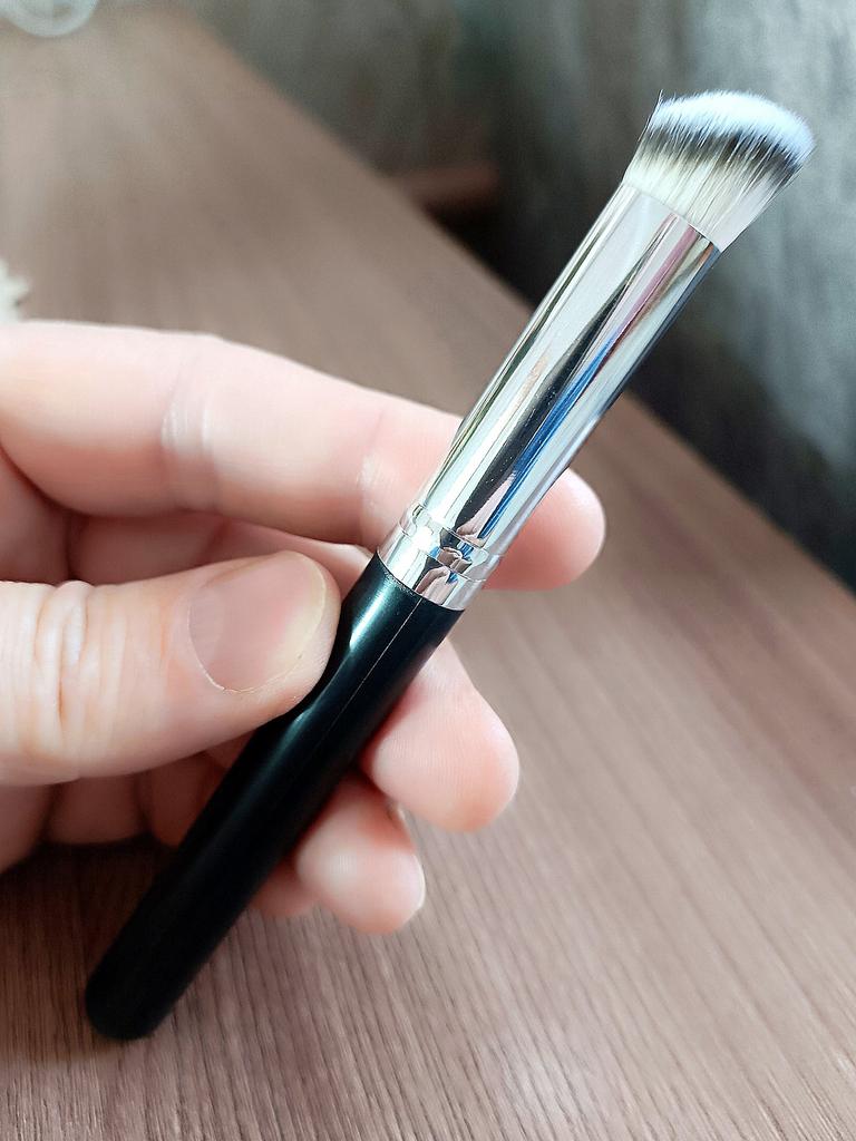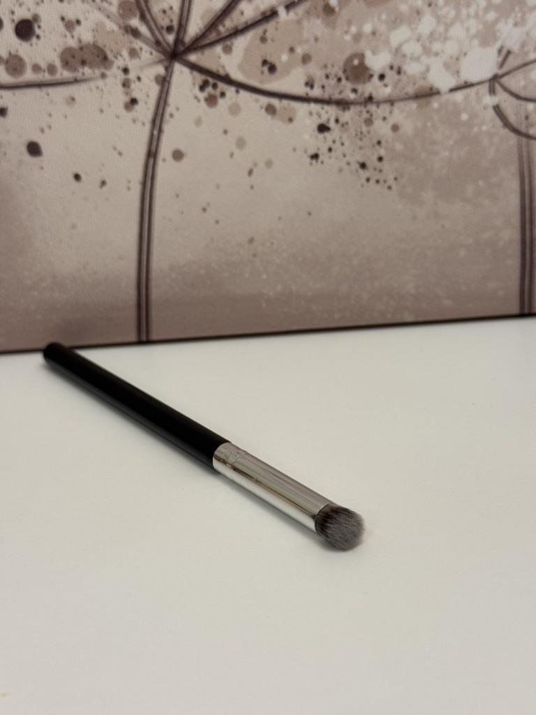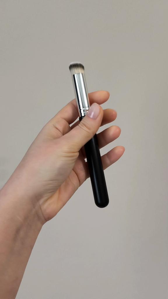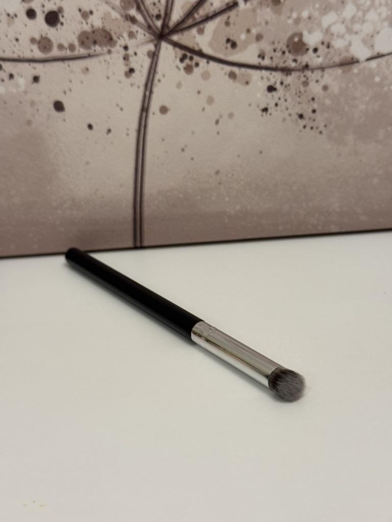 Эта кисть — настоящая «рабочая лошадка» для создания идеального тона. Перед нами классическая плотно набитая кисть с плоским срезом (flat top buffer). Для чего она идеальна? 🔸Тональная основа: Она буквально «втаптывает» крем в кожу, создавая эффект аэрографа. 🔸Консилер: Благодаря небольшому диаметру ей удобно прорабатывать зону под глазами или крылья носа. 🔸Кремовая коррекция: Отлично тушует кремовый скульптор или румяна, не оставляя полос. Плюсы: * Плотность: Густой ворс позволяет добиться хорошего перекрытия даже с тонким слоем средства. * Экономия времени: Она тушует быстрее, чем спонж, и почти не впитывает продукт. * Универсальность: Подходит и для жидких, и для густых текстур.