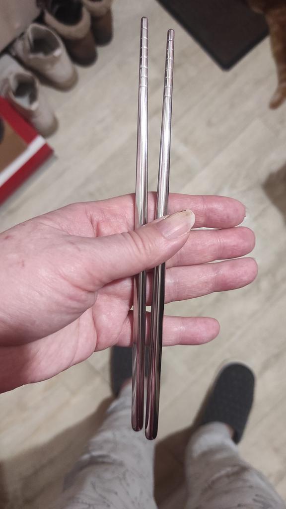 Шикарный набор! Приборы абсолютно не тяжёлые несмотря на то, что металлические. Палочки держать удобно - только кончики у них закруглённые, а остальная часть квадратная. Коробочка закрывается очень плотно. Каждая единица была завёрнута отдельно. Единственное что - цвет коробочки отличается от заявленного.
