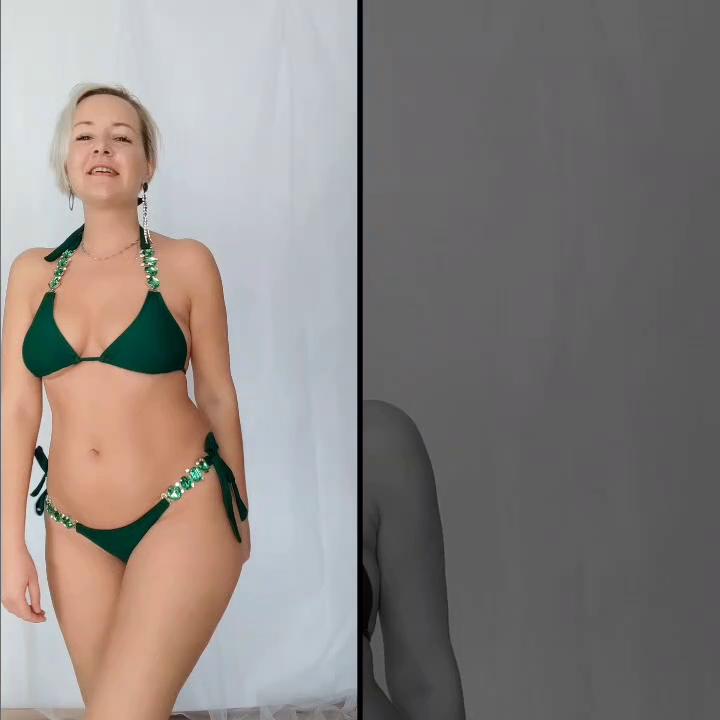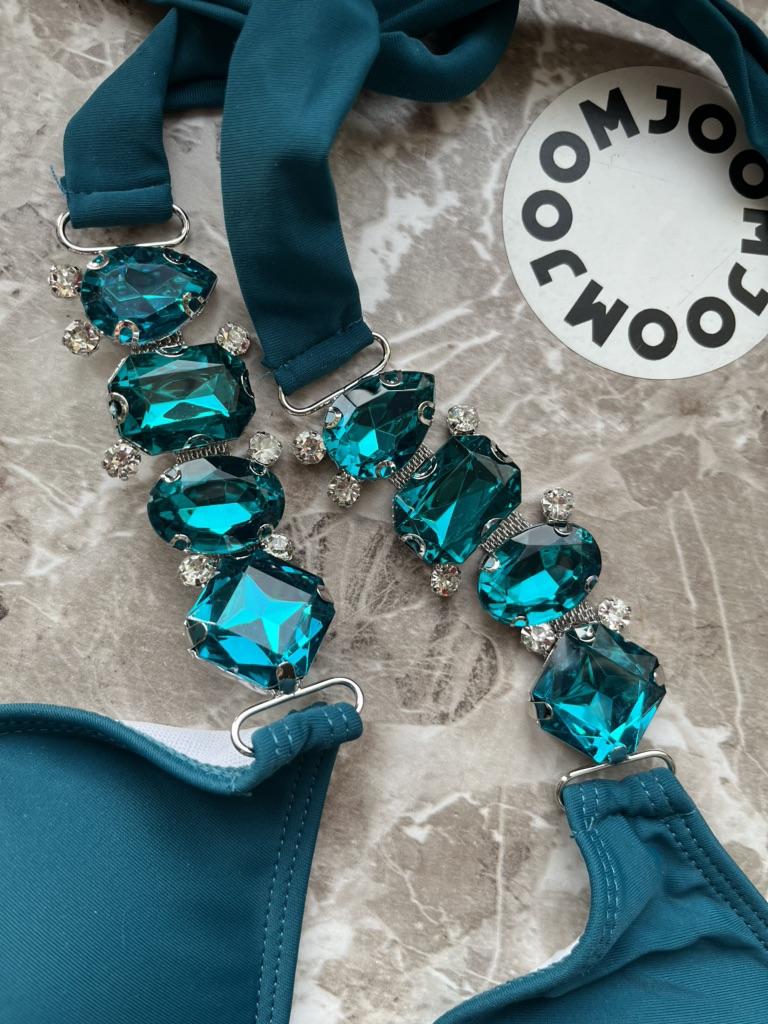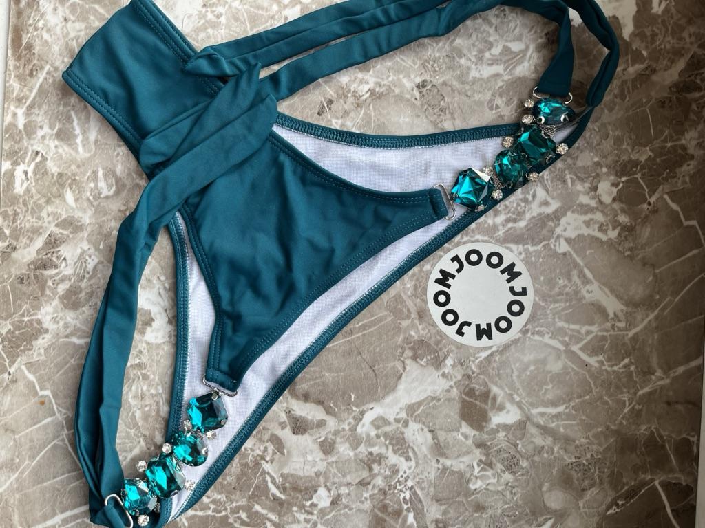 Гламурный бикини купальник, красивыми металлическими украшениями (блестящими большими стразами). Купальник заказала тёмно- зелёный, цвет смотрится красиво, не дёшево, достойно. Металлические вставки сначала пугают, так как кажется, что купальник слетит от тяжести страз, но когда одеваешь купальник вообще не ощущаются эти вставки, хорошо всё держится, ни чего не сползает, легко и удобно. В лифе есть вкладыши, которые если не нужны можно вынуть. У продавца есть разные цвета купальников, мне понравился ещё купальник ярко красного цвета. Не замеченой точно не останешься везде: на пляжной вечеринке, у бассейна, просто на пляже будешь блистать! Купальник не у всех такой - многих камушки смущают, но не меня. Камни яркие и играют на солнце. Я заказала размер S на мои : О.Г - 89 О.Т. - 75 О.Б. - 90 Всё идеально подошло. Плавки хотелось бы чуть пошире впереди, но потом привыкаешь и ничего не смущает. Если взять на размер больше "утону", в смысле купальник большой будет, а не из-за камней на на нём. ) Советую, выбирайте, блистайте. ❤️