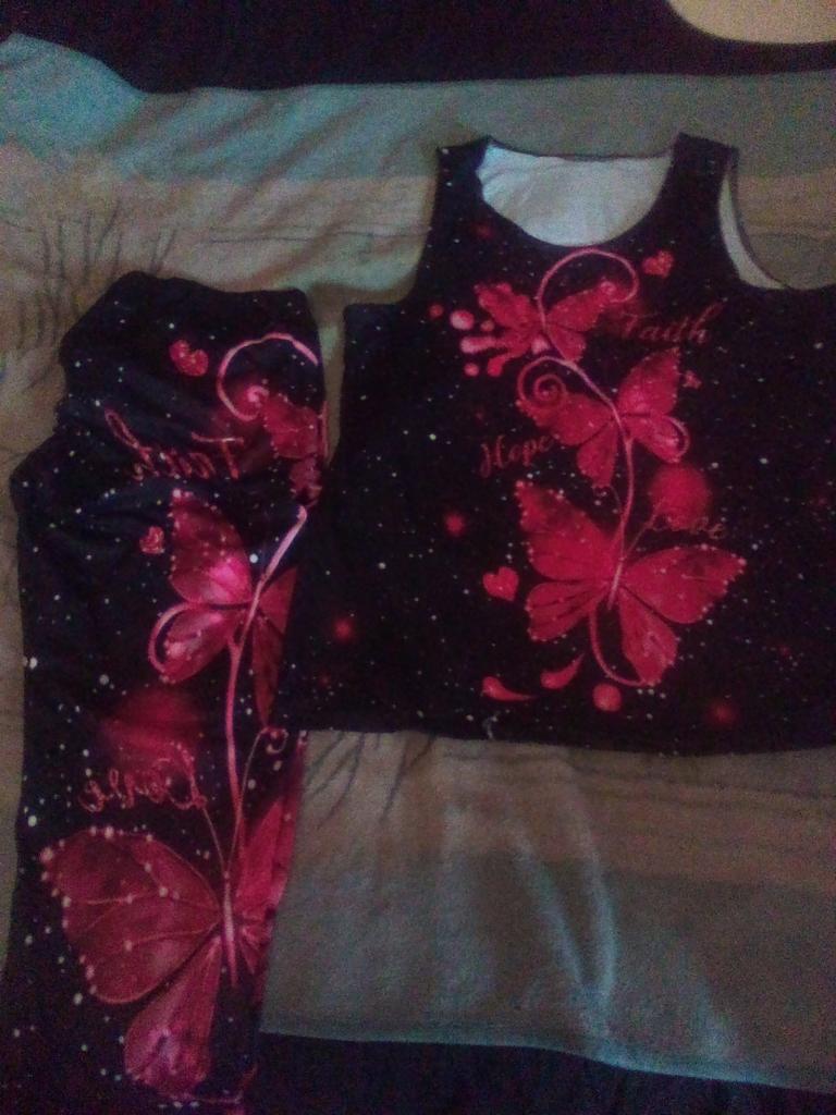 Брюки летние, как ни старалась, учитывая отзывы, взять поменьше размером, - все равно не угадала.Взяла на 2 размера меньше, оказалось надо было взять на 4 размера меньше. Пришлось убивать, чтобы не сильно болтали на теле. Спортивный костюм из лосины и майки,точно так же на 4 размера больше,чем надо.И тоже пришлось убивать. Взяла чёрный с бабочками. По факту ткань оттенок чёрного,ибо на самом деле выглядит, как будто на него туман сел или припорошило чем-то лёгким,поэтому чёрный цвет видится,как сквозь дымку. Но это пустяки: размер уменьшила, с цветом, по размышлению, смирилась. Итог: костюмчик хорош,приятен,элластичен