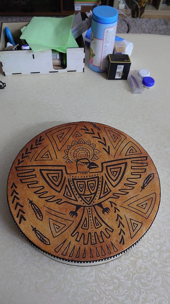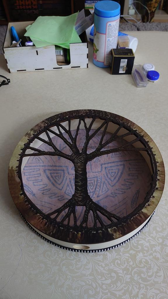 Шаманский бубен. Пластик. Сзади ручка в виде дерева. На палочке мех. Звук издает правильный, шаманский😁 все соответствует. Покупала на подарок. Подарок понравился😁 Рекомендую ❤️
