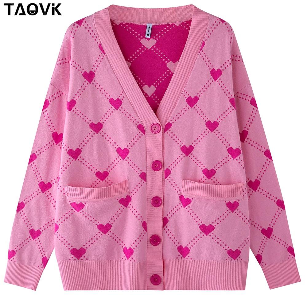 TAOVK Женские вязаные кардиганы, женские свитера с v-образным вырезом и сердечками, свободные повседневные трикотажные изделия с карманами, джемперы Kawaii, Лидер продаж