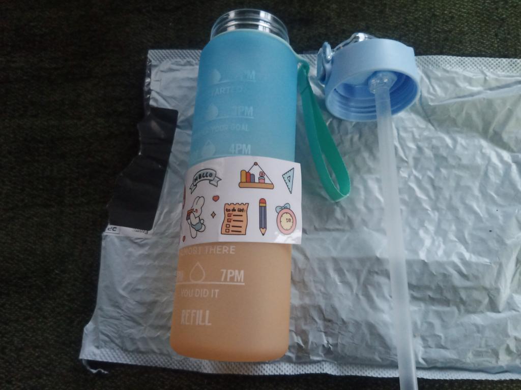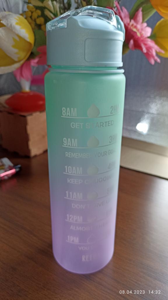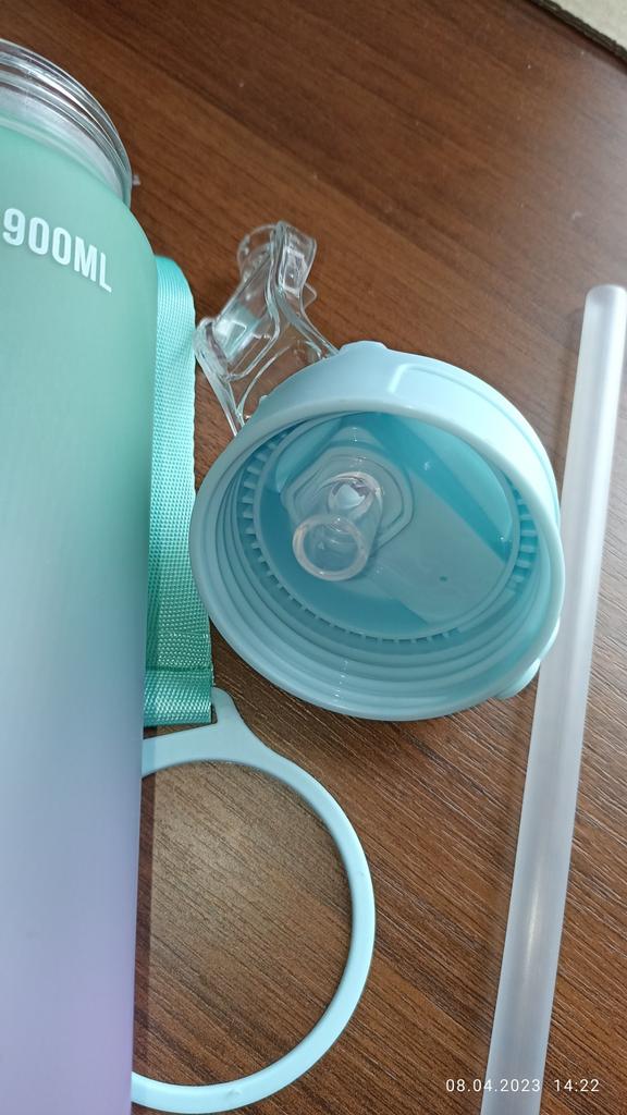 Всех приветствую! Бутылочка для питьевой воды!🔥 🥤Прилетела отлично упакованная в пленку. Ничего не поцарапалась -все идеально!👍 🥤Материал - пластик ( присутствует лёгкий запах нового изделия) 🥤Покрытие матовое - не скользит,в руке держать удобно. Есть съёмная подвесная тканевая ручка . 🥤Удобный механизм открывания - одним нажатием кнопки,есть фиксатор, чтобы при случайном нажатии колпачок не открылся. 🥤Есть силиконовая трубочка - удобно пить.👍 Объем 0,900 мл. ( в реальности около 650 мл) , если налить по плечики, то будет около 700 - 720 мл. Продавец не правильно указал объём! Кому важно , то для первого раза измеряйте сами чтобы было наверняка ! 😉 Высота - 24 см. Диаметр - около 6,5 см. 🥤У продавца есть несколько расцветок на любой вкус! ❗В подарок положили наклейки ❗Бутылочка оооочень понравилась,ну прям любовь - любовь!!! ♥️♥️♥️🥰❗❗❗👍