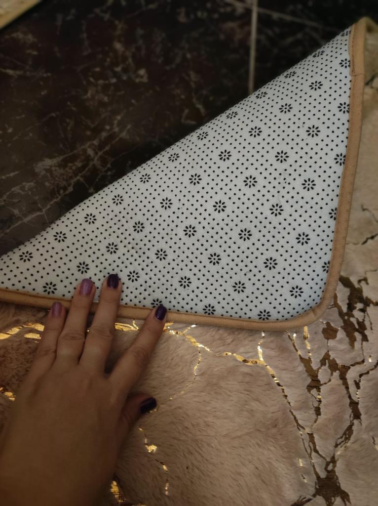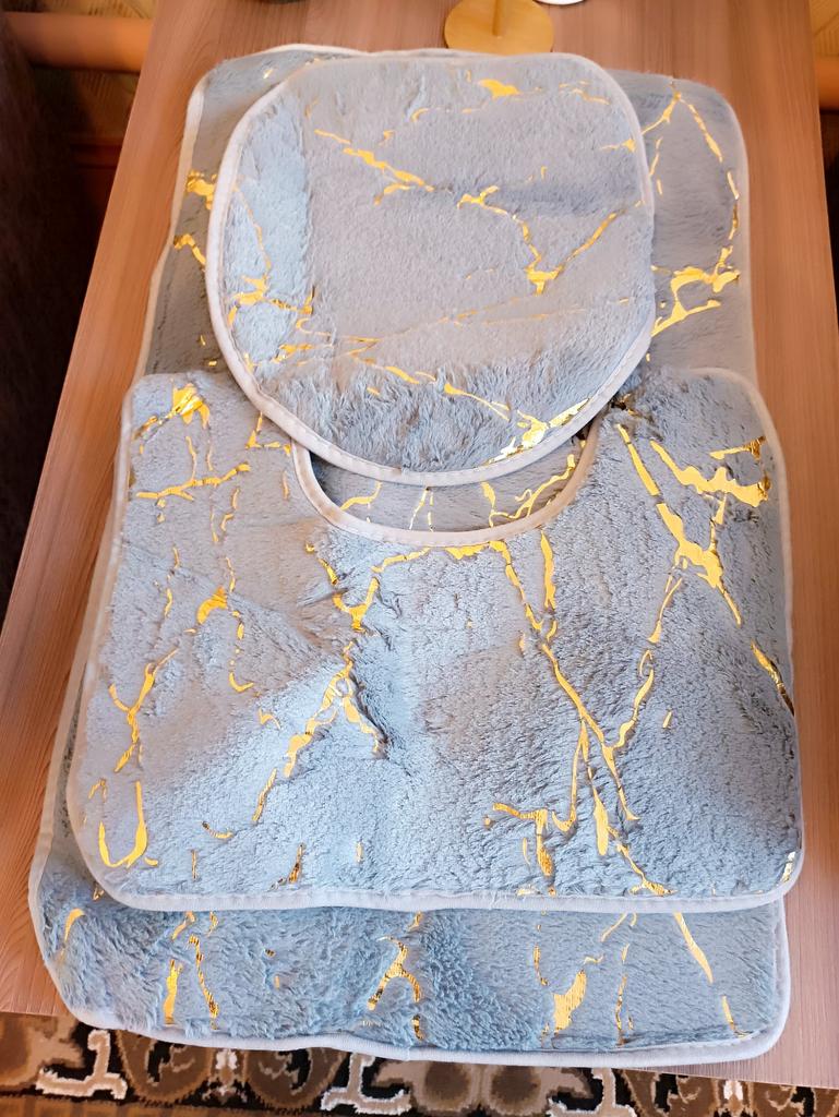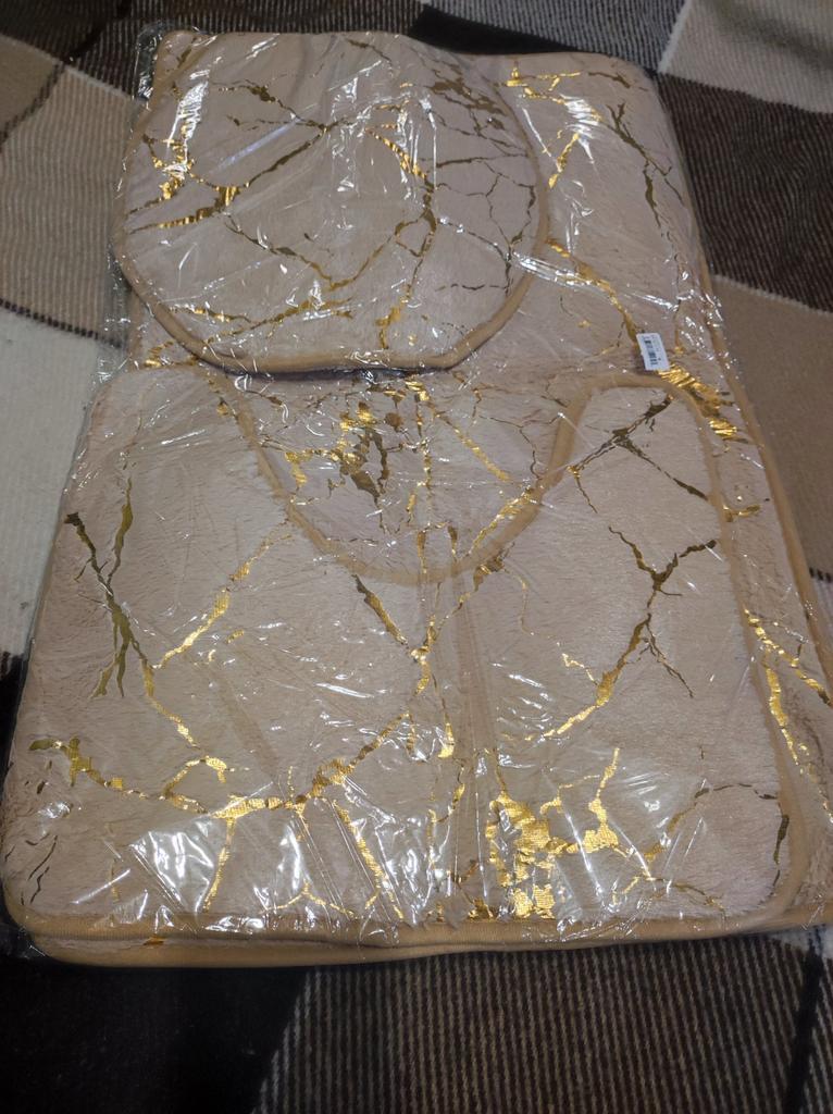 НАБОР КОВРИКОВ ДЛЯ ВАННОЙ КОМНАТЫ 🚿🚽🧽 Это мой повторный заказ. В первый раз мне прислали не тот цвет, и я сразу же отдала их знакомой, поэтому мои впечатления и отзыв были поверхностными. В этот раз тоже не всё гладко. 5 ⭐ поставила лишь для того, чтобы мой отзыв был виден, а не за качество товара. 💥 В комплекте три штуки. Коврики упакованы в прозрачный пакет и сложены вчетверо, поэтому посылка выглядит очень компактно. 💥 На ощупь ворс приятный, мягкий. Золотой рисунок нанесён краской. Как он поведёт себя после стирки - большой вопрос. С обратной стороны есть прорезиненные точки-цветочки, чтобы коврики не скользили, но они не дают достаточного эффекта. Коврики ёрзают туда-сюда. Коврик для крышки унитаза крепится с помощью двух толстых резинок. 💥 Коврики вырезаны криво, это очень заметно на фото. Резинки пришиты на разном уровне. Внешний вид - это единственное достоинство этих ковриков. Заказывать или нет - решайте сами. Я не в особом восторге от покупки. Желаю всем только удачных покупок 🛍! 💋💋💋