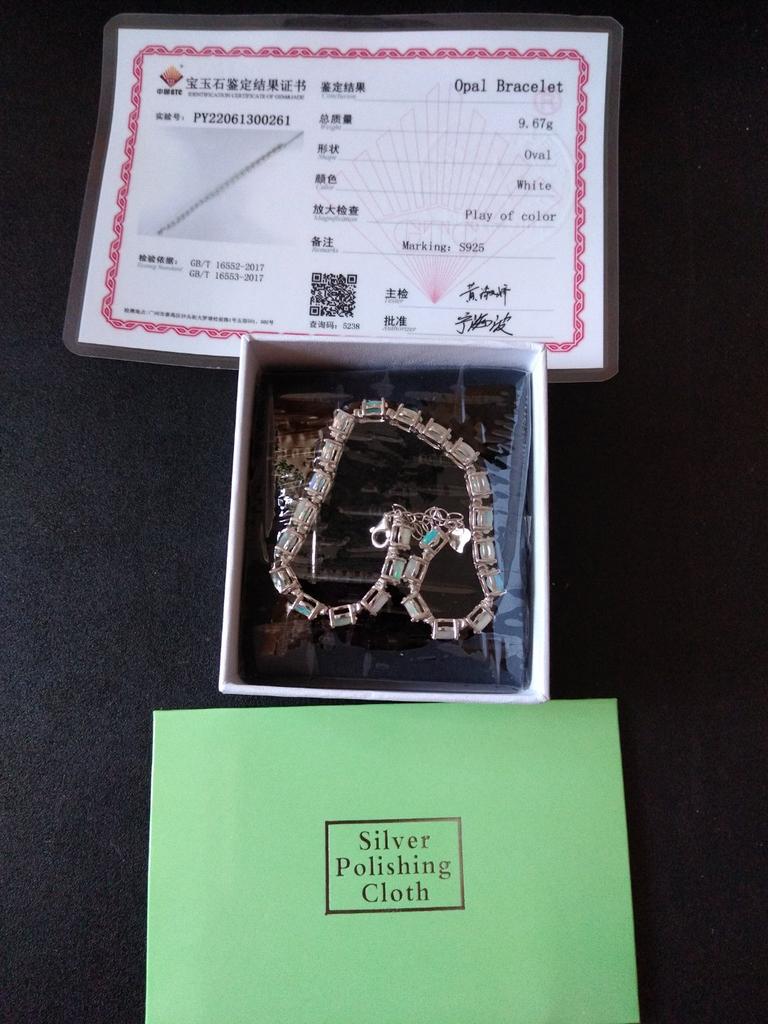 Доставка, упаковка на высоте. Смотрится великолепно. С эстетической точки зрения. Минусы: нет сертификата на камни и серебро, застежка не удобная - самостоятельно не надеть. Конечно наивно надеяться, что это натуральный опал (цена), точно можно сказать, что это не дуплет или триплет ( прозрачные камни?), очень хочется надеяться, что это не стекло или пластик, а хотя бы искусственно выращенные камни, иначе цена на бижутерию неоправданно завышена и продавец описанием товара вводит в заблуждение покупателей