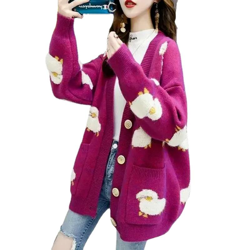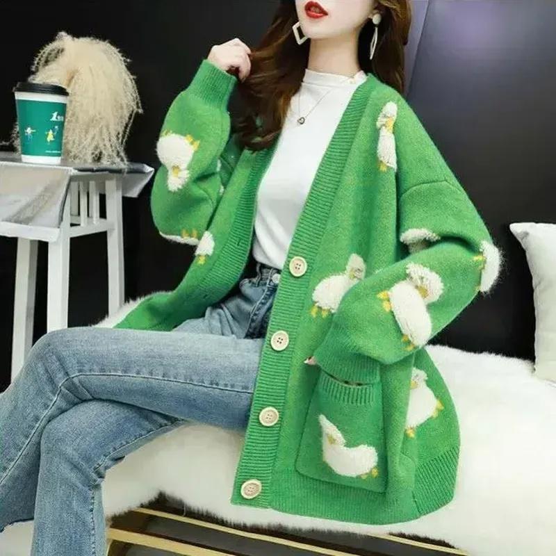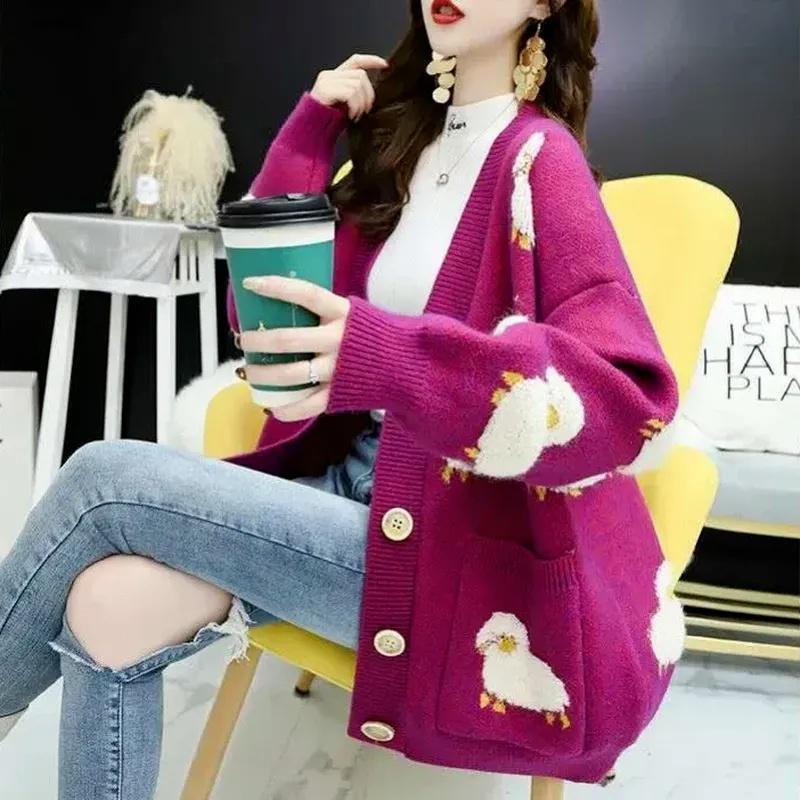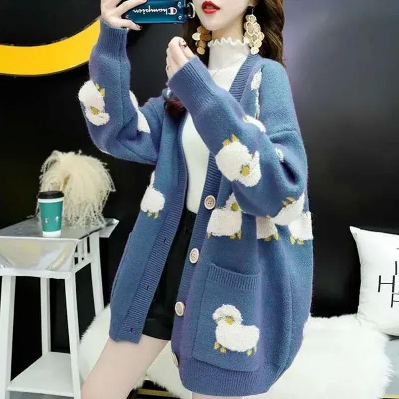 Женский осенне-зимний вязаный кардиган, свободный уличный вязаный свитер, пальто, милый свитер с v-образным вырезом и мультяшным принтом, куртка