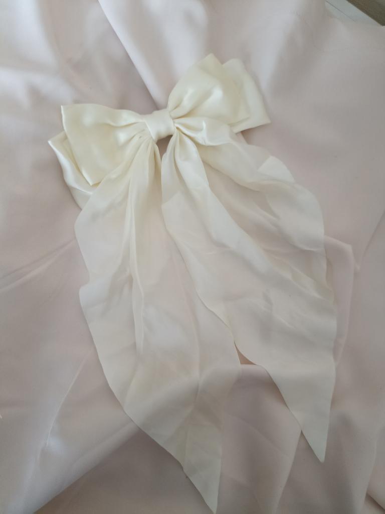 В посылку объединили сразу три заказа, поэтому начну по очереди. Итак, первая позиция: заколка для волос с бантом По размеру бант довольно крупный (ширина 20 см, общая длина чуть больше 30 см) По цвету соответствует фотографиям продавца - нежный молочный оттенок придает банту винтажный вид. Заколка надёжно защелкивается и легко раскрывается при нажатии на язычки пластины, ничего не помнит и не цепляет. Заколка, думаю, подойдёт и на не густые волосы: довольно плотное смыкание пластин. Пришел бант мятый, нужно отпарить и прогладить. Но, думаю, с этим проблем не возникнет. Единственный минус заколки - бант не держит форму, обвисает, так как ткань очень тонкая. Это, конечно, красиво смотрится на ниспадающих лентах, они придают струящейся нежности, но хотелось бы немного жесткости в самом банте. Попробую слегка накрахмалить, возможно спасет ситуацию Доставка в Северный Казахстан заняла месяц, что, в принципе, стандартный срок.