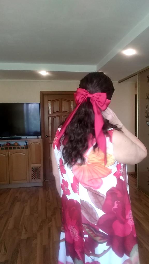 Отличная шелковая заколка бант. Заколка стандартная, обычная. Прочная, держать волосы будет крепко. Сам бант больше винный , чем красный. На моих многочисленных фотках отображён цвет верно. Гладится легко. Длинный, красивый. Жаль моих волос для него маловато, но я собираюсь его использовать на парики, на шляпку и даже на сарафан. Советую к покупке. Шел долго, в сборной посылке, 43 дня