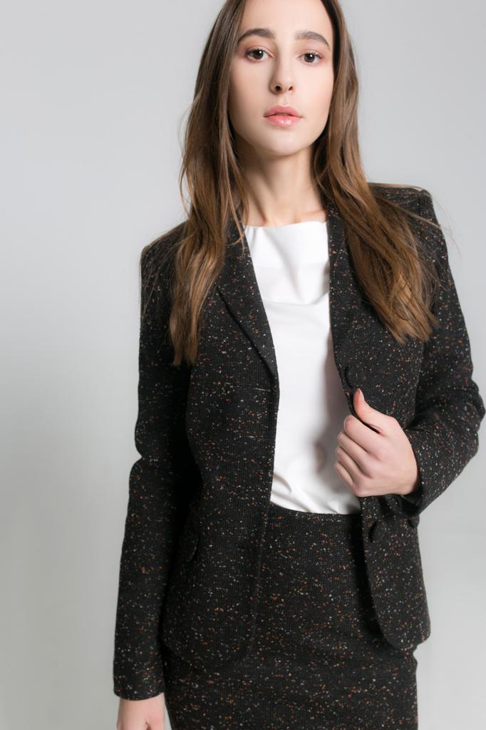 Классический приталенный пиджак на три пуговицы меланжевая теплая ткань с подкладкой