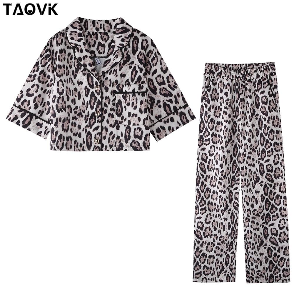 TAOVK Женские брючные костюмы, сексуальные леопардовые мини-топы с v-образным вырезом и короткими рукавами, рубашки + широкие брюки, комплекты из 2 предметов, верхняя одежда