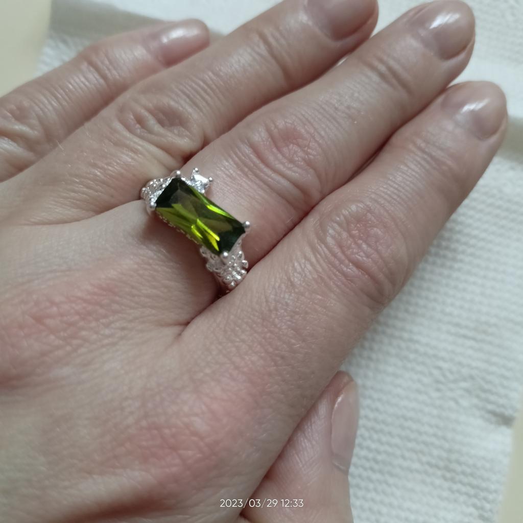 Обзор 4. Получила безразмерное колечко с прямоугольным цирконом, похожего на камень хризопраз. Вакуумное покрытие для аллергиков. Кольцо широкое, внутри кольца стоит 925 проба. На мой 17,5 размер, кольцо село с трудом, сидит плотно и раздвигается тяжело, можно сломать. Покупала за очень приятную цену 178 р. со скидкой. Доставка в Архангельскую область 1,5 месяца. Более подробно, смотри в 1 обзоре.