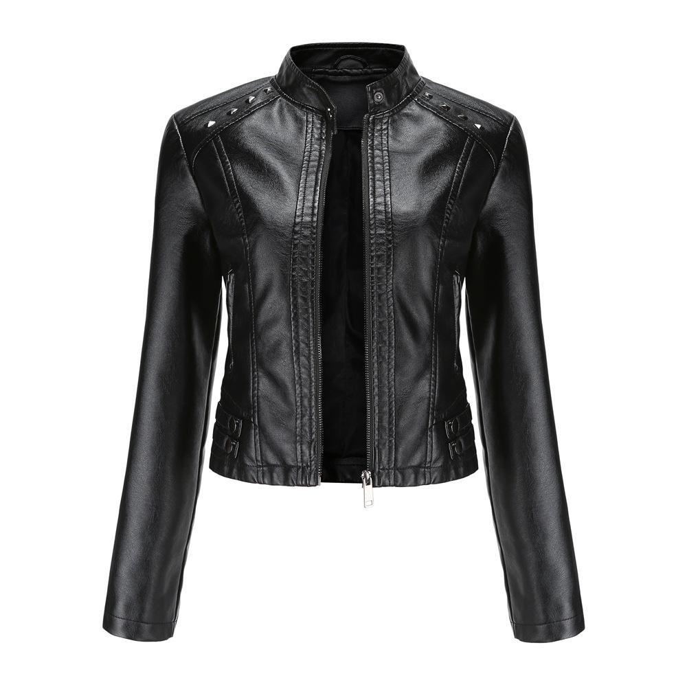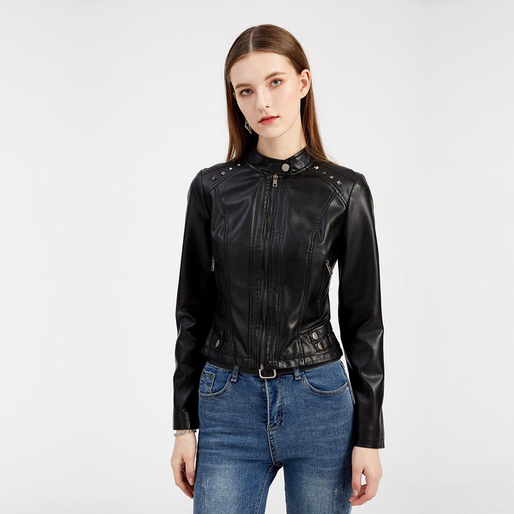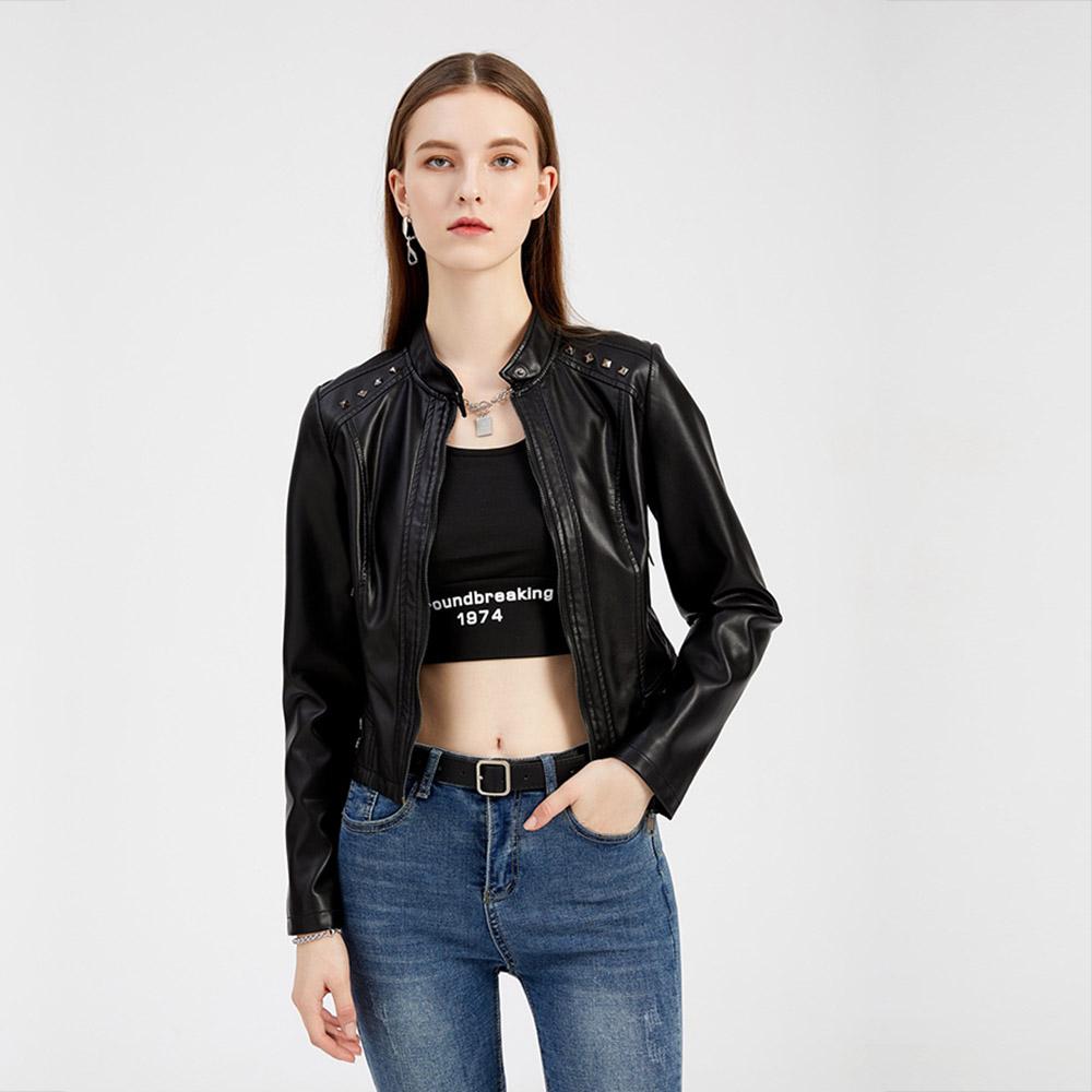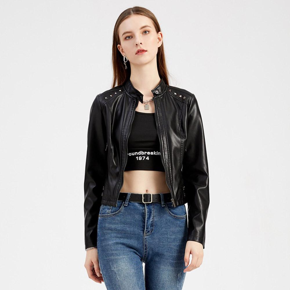 Женская весна-осень короткая заклепка-стойка с воротником-стойкой и длинным рукавом на молнии тонкая кожаная куртка из искусственной кожи S-3XL