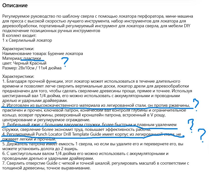 Продавец обманывает и вводит в заблуждение покупателя ё В одно месте он пишет, что "Удобный трудосберегающий пластиковый стальной шаблон для деревообработки". В полном описании, что сальной корпус из высоко легированной стали: "2. Изготовлен из высококачественного материала из легированной стали, он против ржавчины, практичен и прочен, ключевой патрон, конический вал контроля глубины и ограничительное кольцо, возврат пружины, реверсивный кронштейн патрона, встроенный в V рощу, центрирование и регулируемое ограждение. 3. Дюбельный джиг с большим вакуумом стружки, более быстрым и плавным удалением стружки, сверление более экономит труд, повышает эффективность работы. 4. Регулируемый Punch Locator Drill Template Guide имеет корпус из легированной стали, не ржавеет легкий и прочный. 5. Держатель патрона имеет емкость 1 сверла, но если вы удалите его и перевернете его, вы можете установить долота до 2 вширь. 6. С шестиугольным валом 1/4 дюйма его можно использовать с аккумуляторными и проводными дрелью и ударными драйверами. 7. Сверлить отверстие Guide с четкой и точной шкалой, регулировать масштаб в соответствии с толщиной древесины, точное выравнивание." На фото корпус стальной, а прислали из пластика.