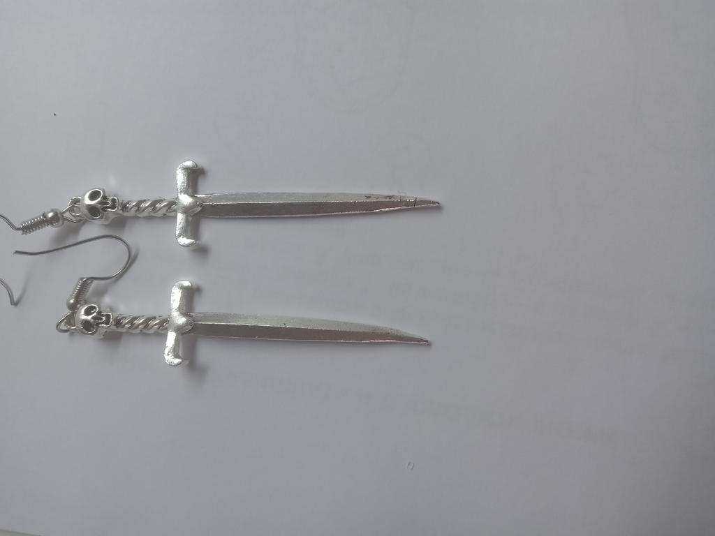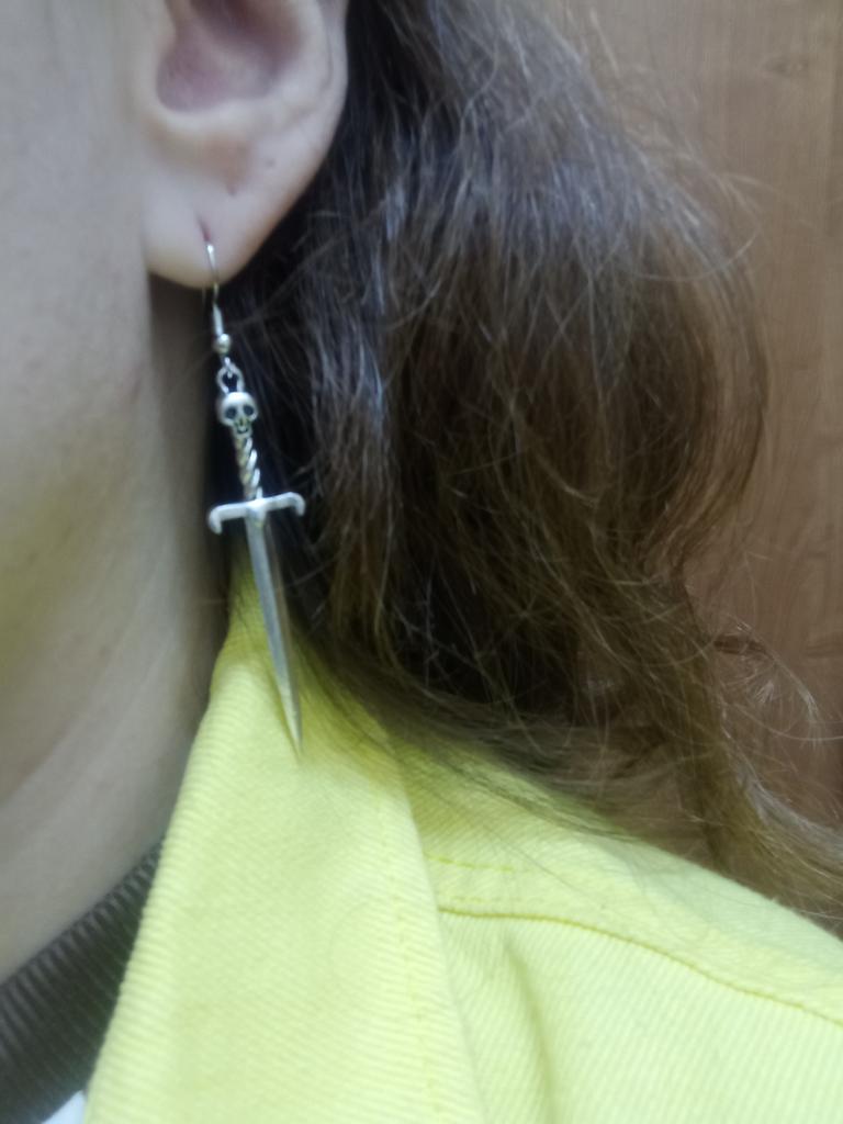 заказ приехал за месяц. серёжки классные, но мечи пришли кривые во все стороны, на фото видно, разочарована. плюс положили заклёпки, за это спасибо.пришли все, одни на мне. в принципе за такую цену брать можно