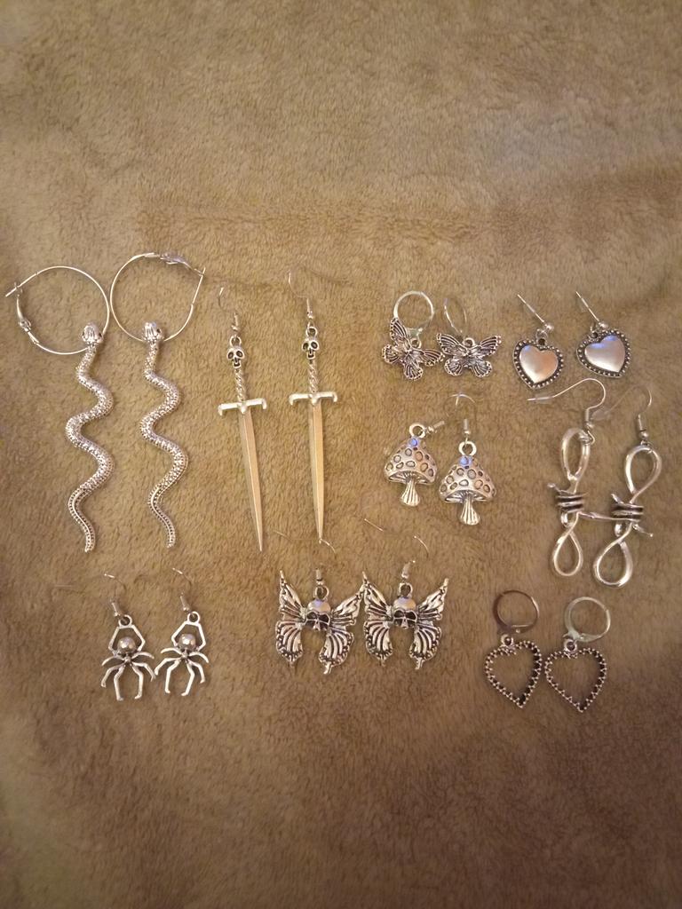 Интересный набор серёжек в готическом🗡стиле, 9 пар, по качеству неплохие, смотрятся интересно, пришли просто россыпью в пакете, без повреждений, продавцу спасибо🤗, рекомендую🥰 В комплекте прилагались ещё заглушки